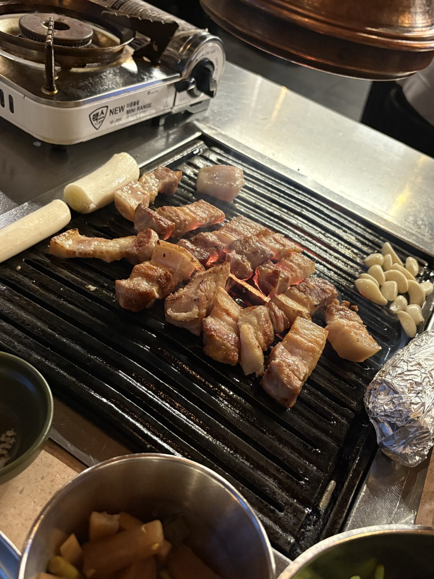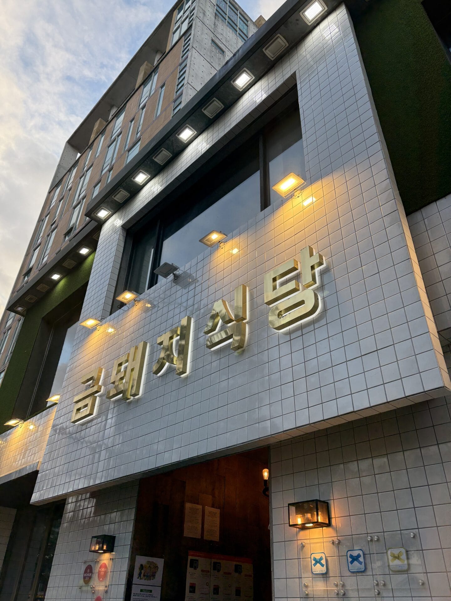 夜ご飯は金豚食堂へ行きました🐷このお店はミシュランに6年連続掲載される程美味しくて人気のサムギョプサルのお店です!日本語を話せる店員さんもいて、オススメなど優しく教えてくれました🤧平日の18時前に行ったにも関わらず1番人気の骨付きサムギョプサルは完売でした😭そのため食べたのは骨無しサムギョプサルでしたがとても美味しかったです!お肉はもちろんエリンギの1本焼きも最高に美味しかったです🙋♀️お店は日本人だけでなく現地の人からも人気でとても賑わっていました!私は後で知ったのですがBTSも通う人気店だったそうです😂韓国アイドルが好きな方は是非推し活みたいな感じで行ってみてください笑