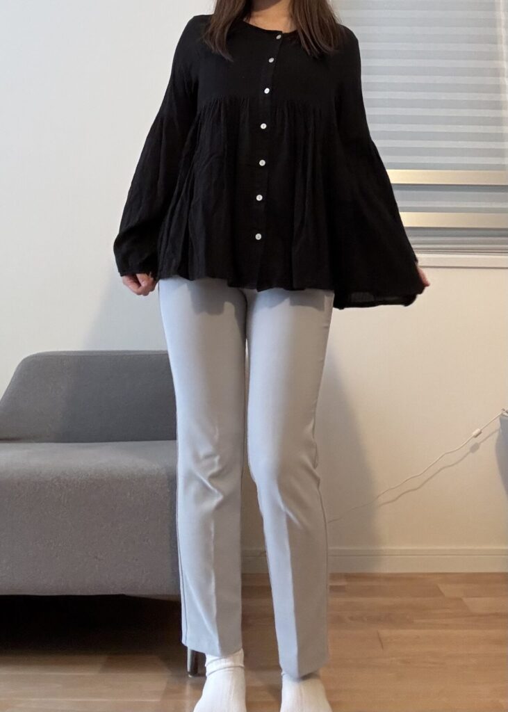 最初のコーデは黒のシフォンブラウスに、パステルブルーのテーパードパンツを合わせました。
