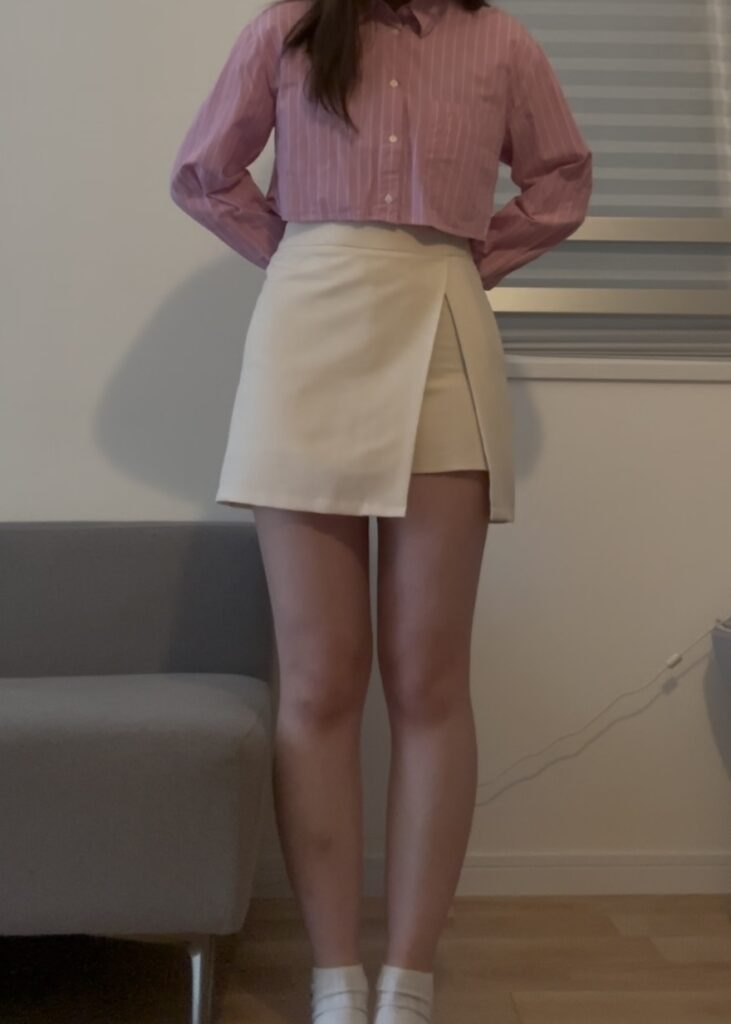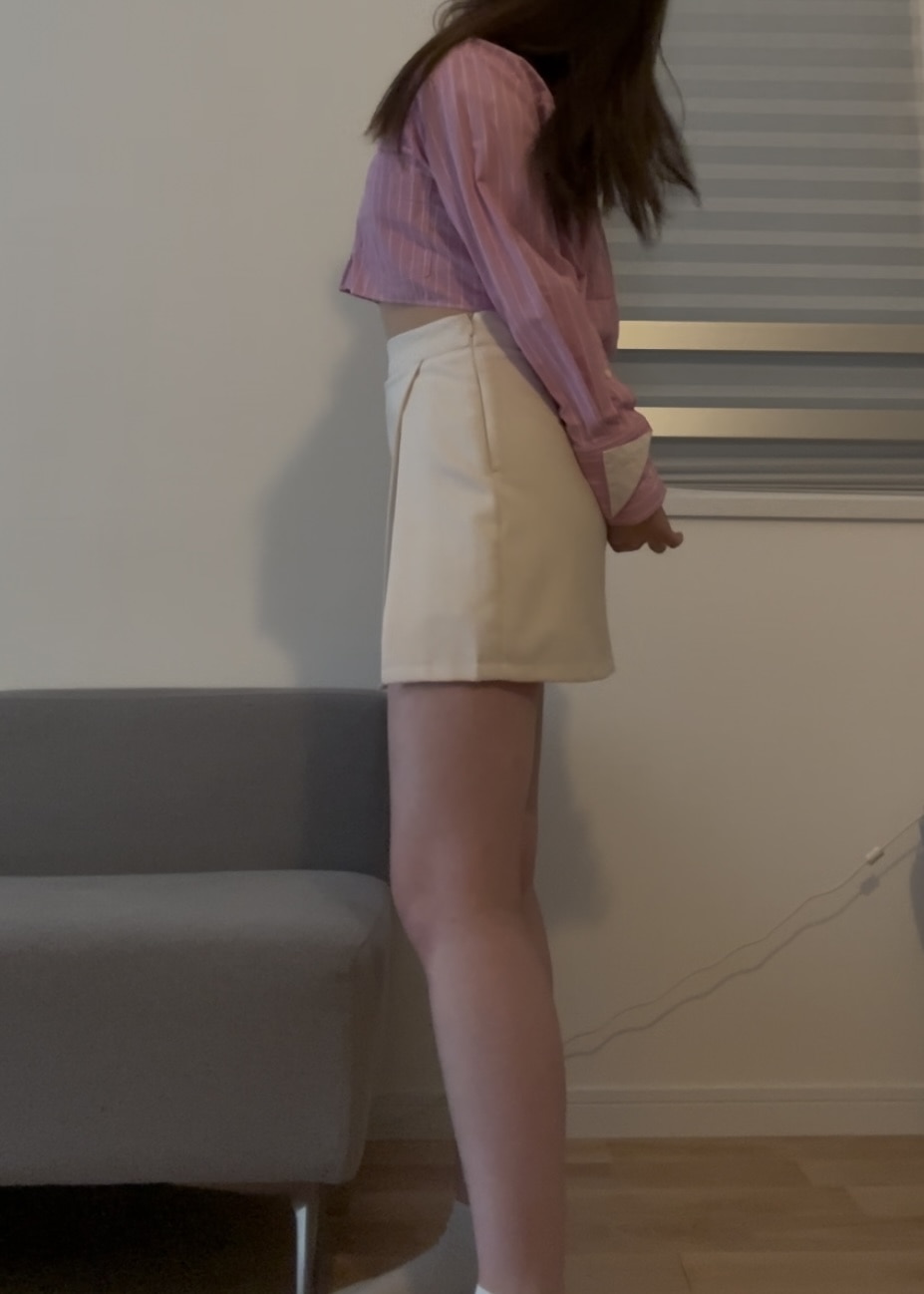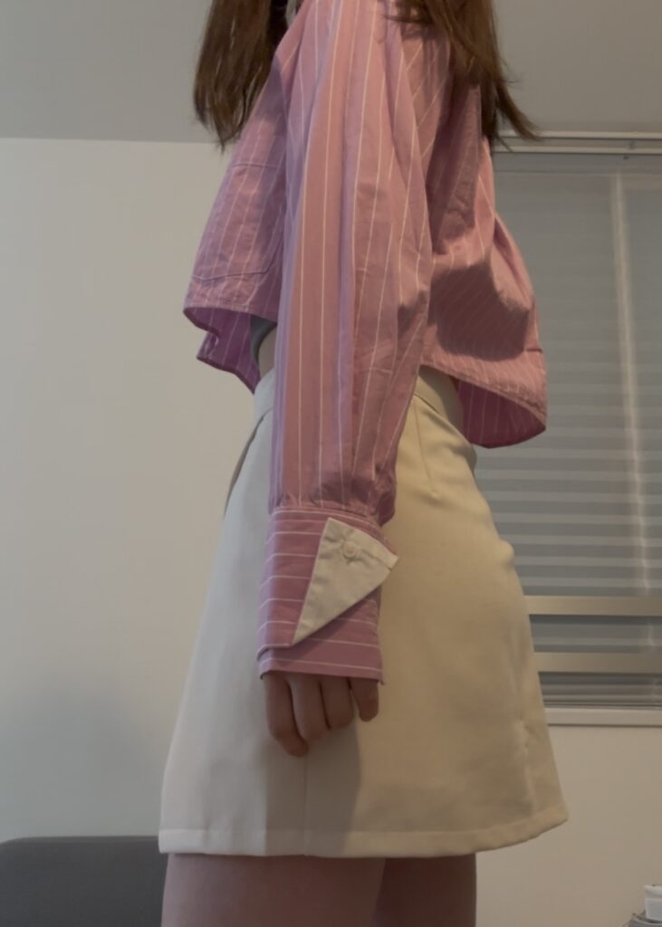 次は、ピンクのストライプシャツと白スカートのコーデです。