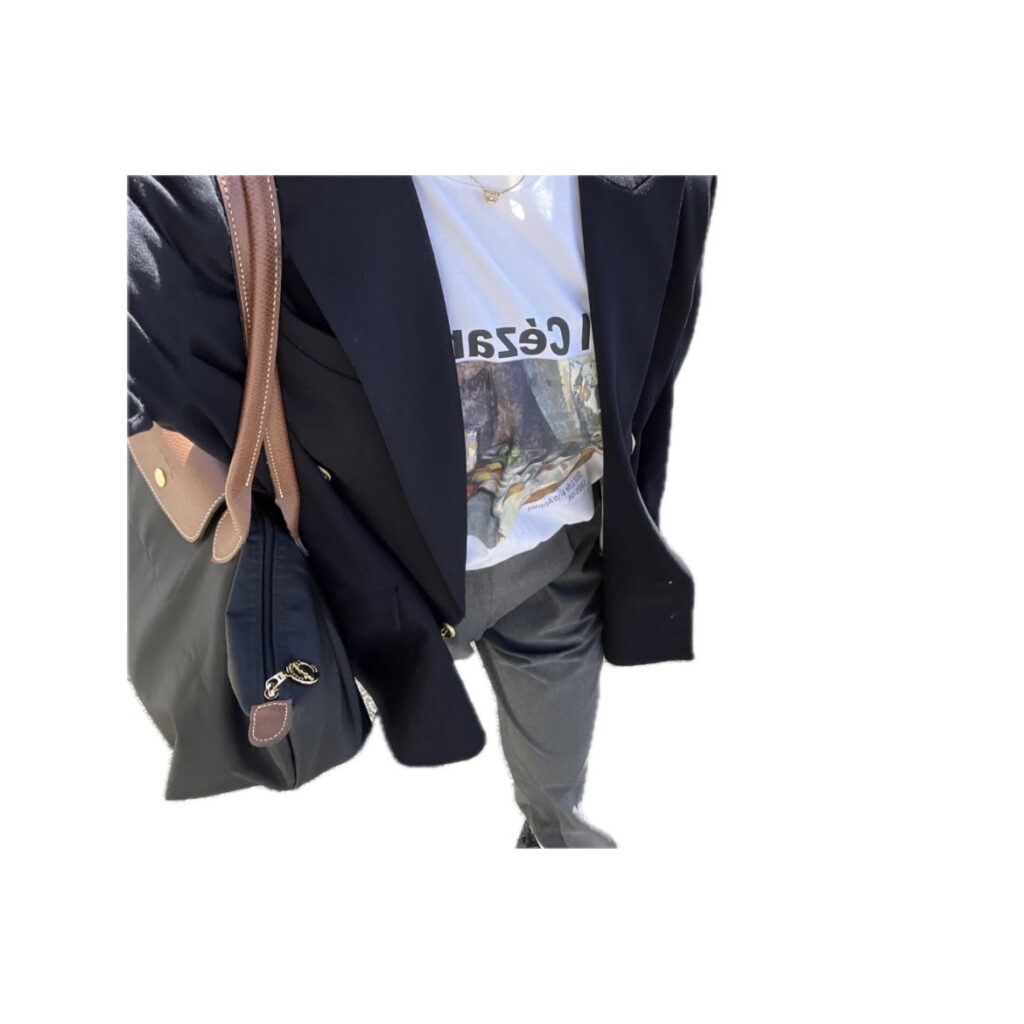 中は半袖のTシャツを着ています。ちなみにこれは昨年ユニクロとMOMAがコラボしたTシャツです!