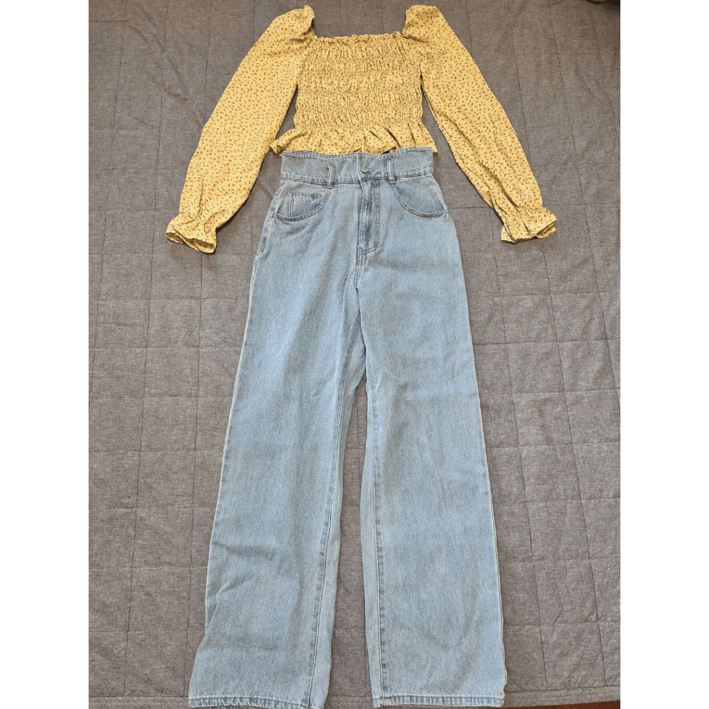 トップスは、イエローカラーで春らしいデザインになっています。若干透け感のある素材なので、通気性がよく、沢山歩き回るような日にぴったりです。