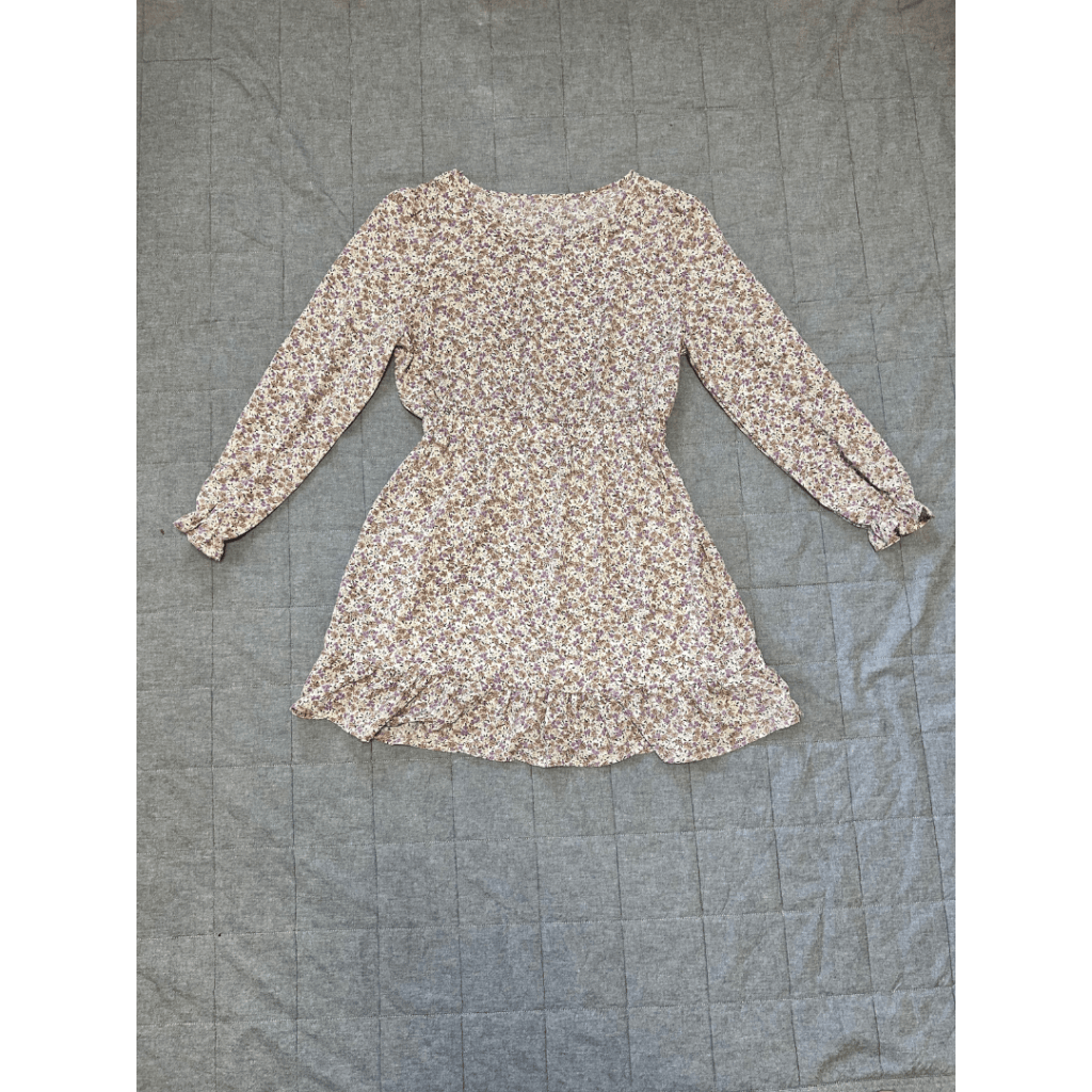 このワンピースは、透け感のある素材でできていますが、スカート部分には裏地がついているので、着やすいです。お花柄なので、お花畑に行くときに着ていきたい服です。4月の夜に着る場合は、このワンピースだけだと寒いと思うので、カーディガンなどを1枚羽織るのがおすすめです。