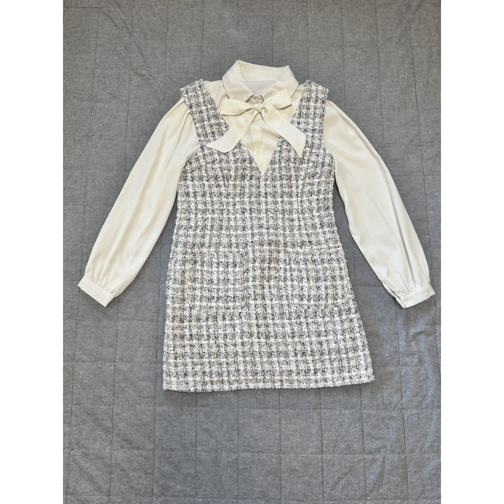 白のシャツは、ほかの商品とのセットアップに付いてきた服で、さらさらとした生地になっています。リボンは付け外しが可能なので、コーディネートに合わせて変えることができます。