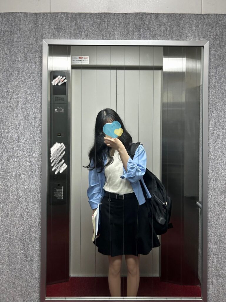 この日はとても暑く、あまり冷房の利かない教室での授業だったのでミニスカートとリブのぴったりとしたシルエットのTシャツを合わせました
