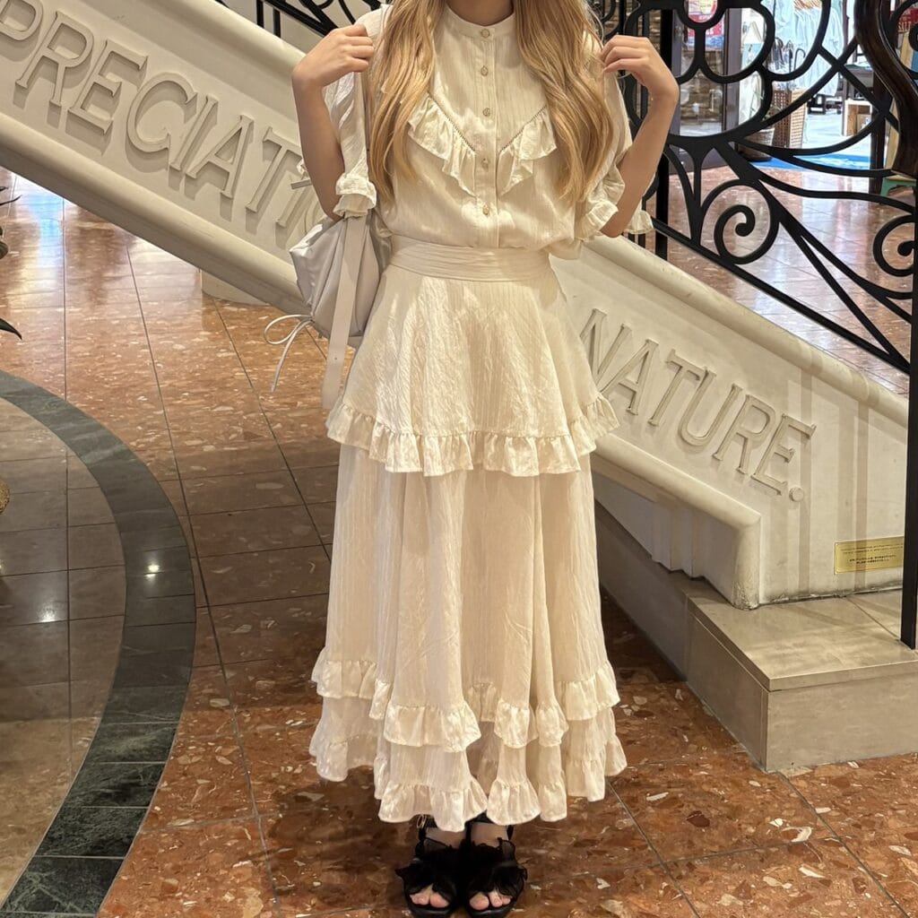 レトロ可愛いアイテムが沢山揃うtnewties(トゥエンティーズ)で今年ゲットしたフリルブラウスとスカートのセットアップ!フリルがたっぷりあしらわれているのに、甘すぎなくて少しお上品な感じがとってもお気に入りです♡