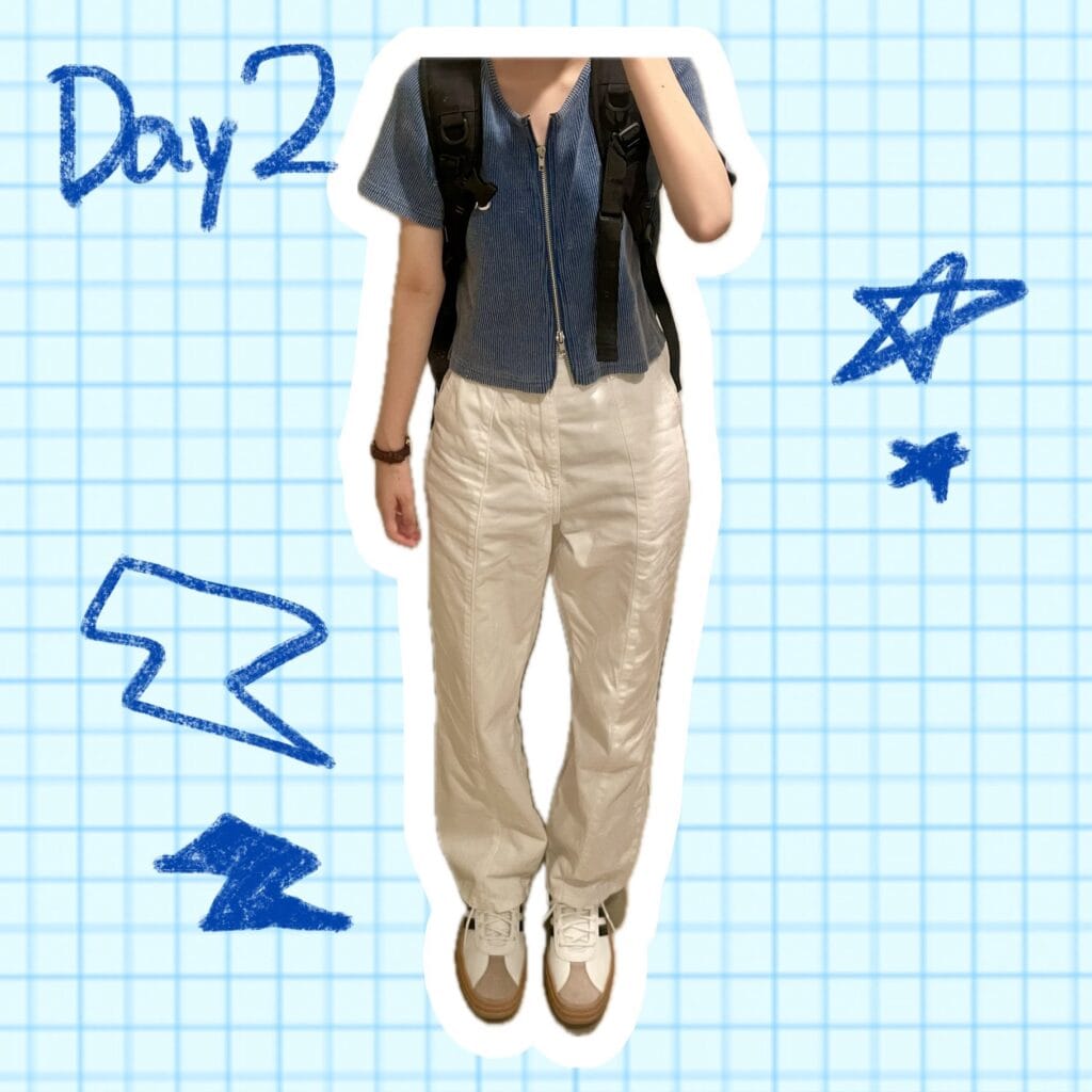 流行りのY2Kスタイルに。荷物多めのリュックの日でも可愛く!