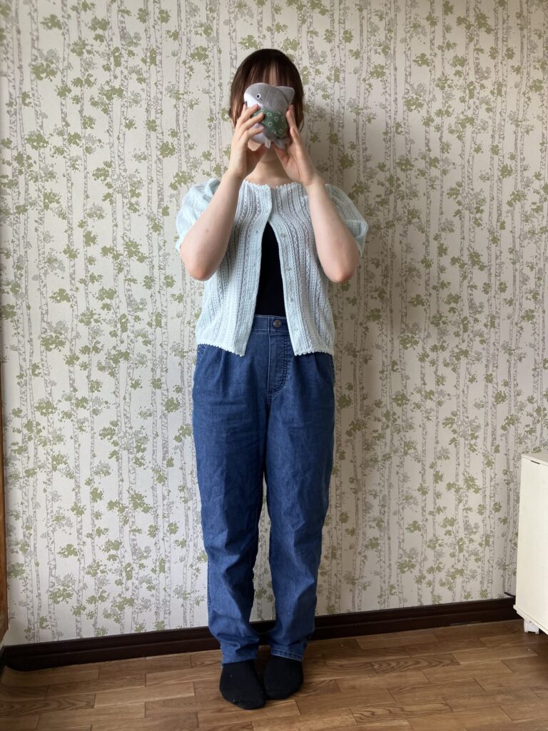 デニム風のボトムスをインすることで、ウエストの位置が高めに見えるよう意識しています。生地も薄手なので暑い日にも快適に過ごせるコーデです☀️🫠