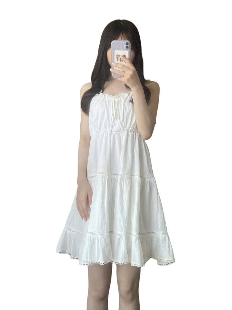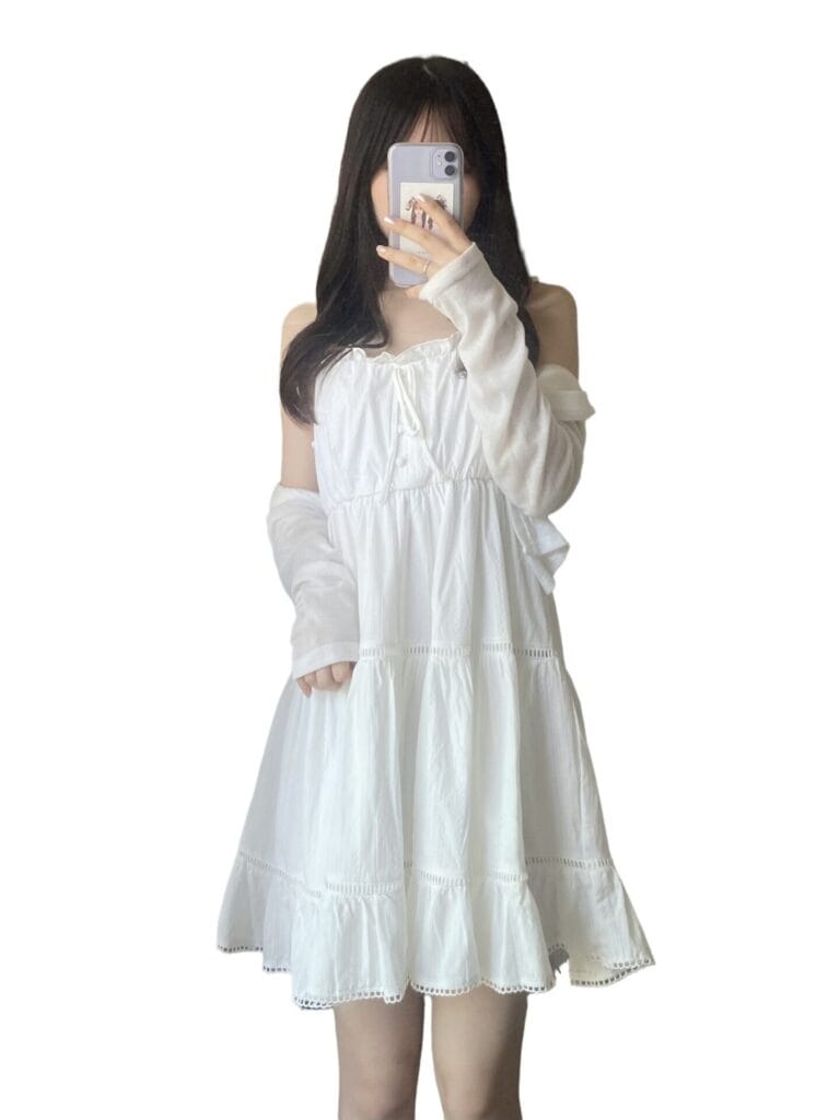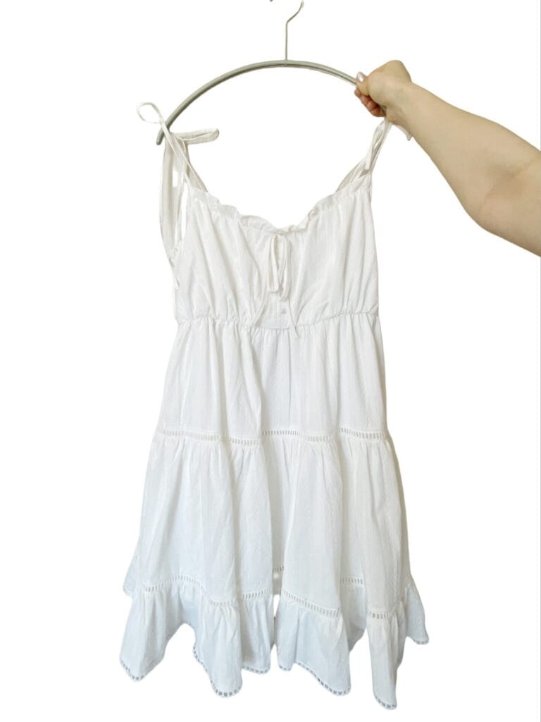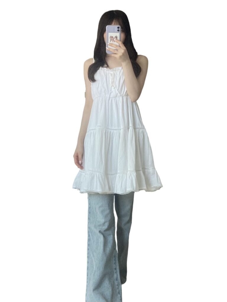 ガーリーな白ワンピだけど、デニムを合わせることで一気にコーデの印象が変わります♡