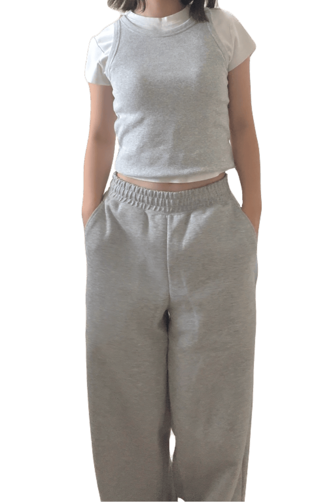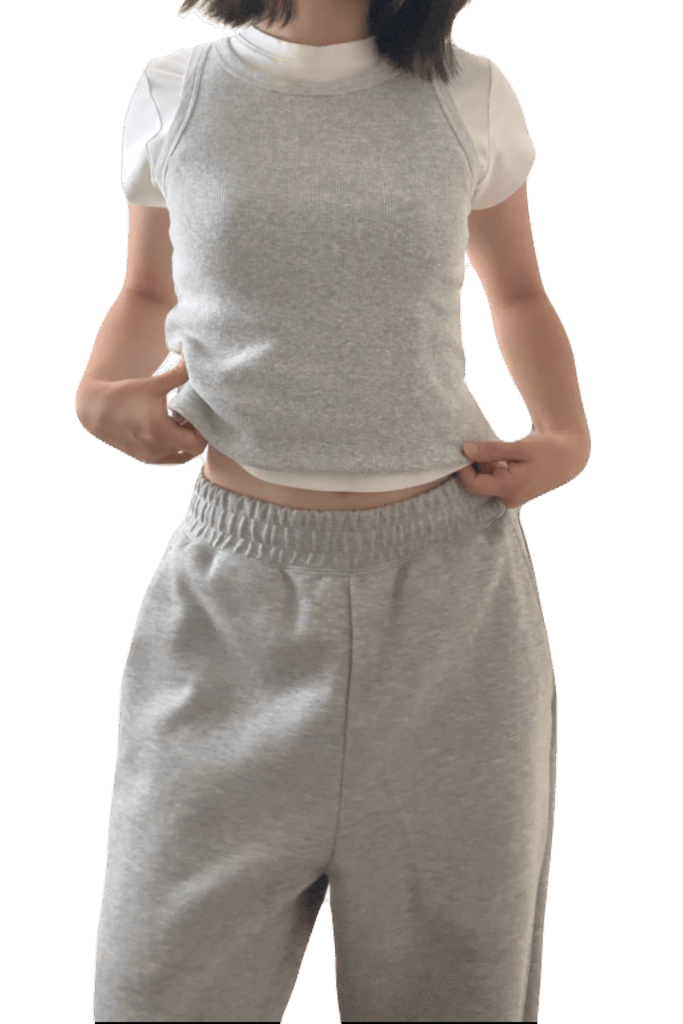 白Tの上にグレーのタンクをレイヤードして、ニュアンスのあるこなれスタイルに。
