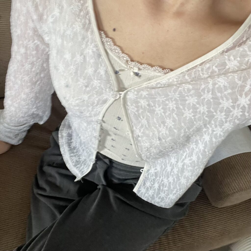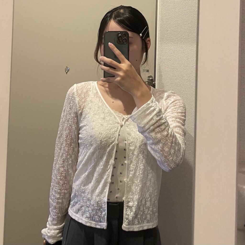 こちらは前のコーデでご紹介したアイテムの柄なしバージョンです。白を着用しているのですが、カラーや柄ありのものより、下着が透けやすいので、注意してください!!
