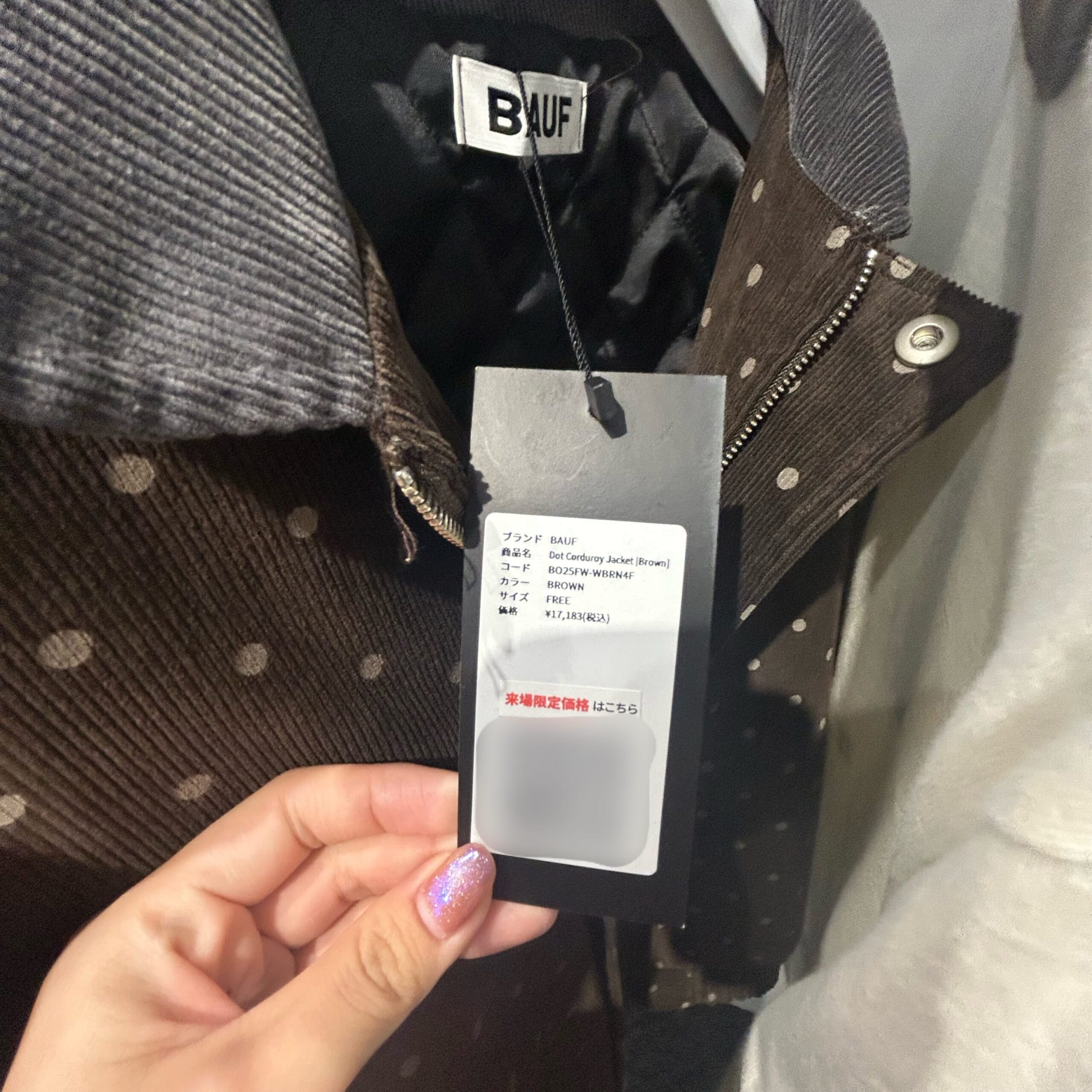 ・服のタグに記載のQRを読み込むとポップアップ来場者限定20パーセント追加割引! このようにそれぞれの商品にQRがついています。