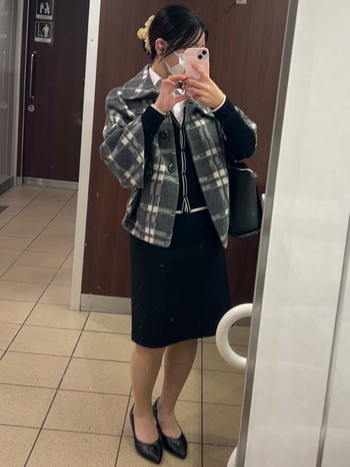 この日はスーツの日。しかしどうしてもスーツスーツしたくなくてアウターは可愛い目のポンチョ。