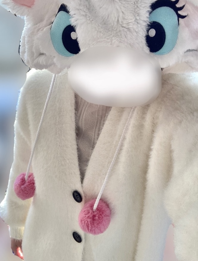 その上から、白のふわふわのカーディガンを。これが、カチューシャを選ぶときに「マリーちゃんみたい!!」と友達と偶然発見したので、ファンキャップをお供に♡(全く意識していませんでした(笑))