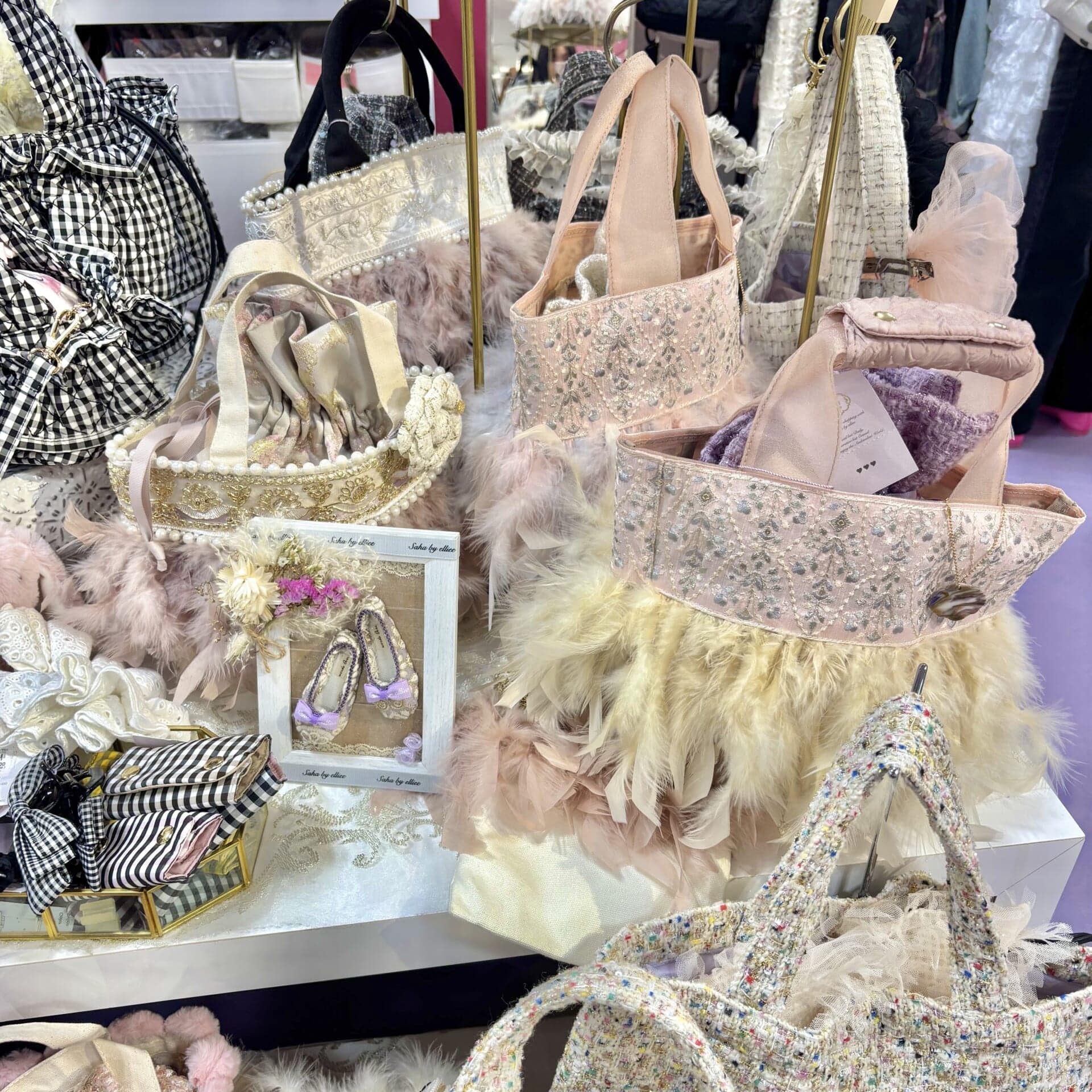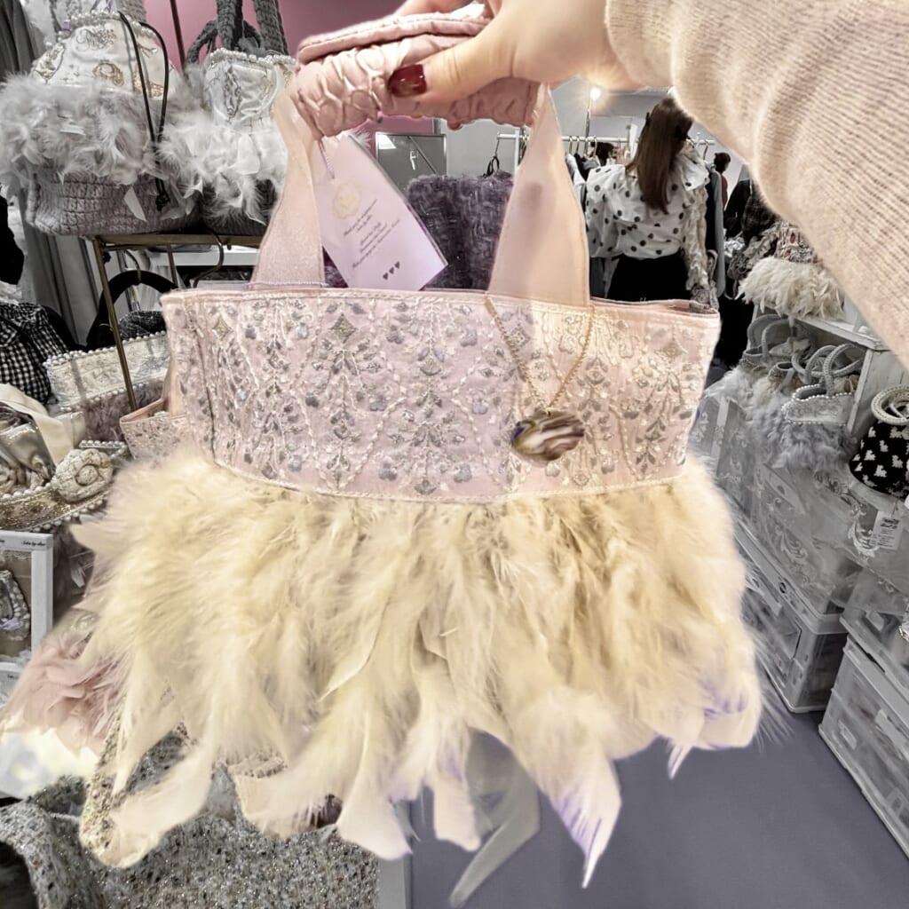 細かな装飾が施されたトート生地のバッグに、ふわふわのフェザーがたっぷりあしらわれていて、とても個性的で唯一無二のデザインになっています♡実は私も、2年前のこのイベントで水色のバッグを購入して、今でも大切に愛用しているお気に入りです🩵