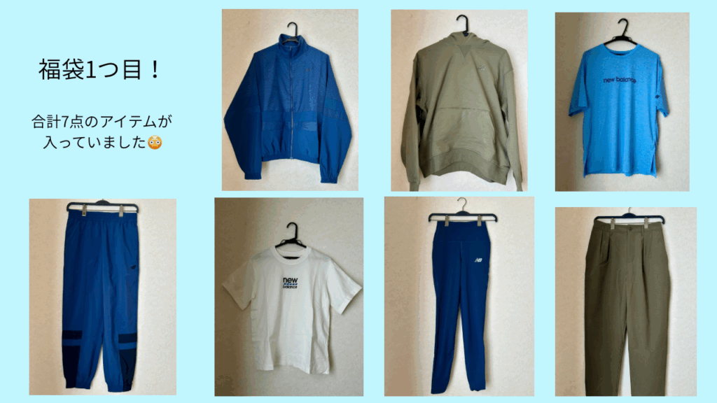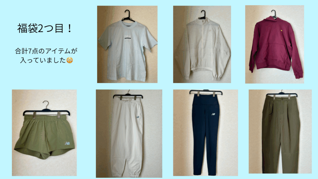 1つ目の福袋には、7点のアイテムが入っていました!季節を問わず使えるアイテムばかりで、外でランニングすることが好きな私にとってぴったりでした! ちなみに定価で買うと約55000円相当で、とてもお買い得な福袋でした。