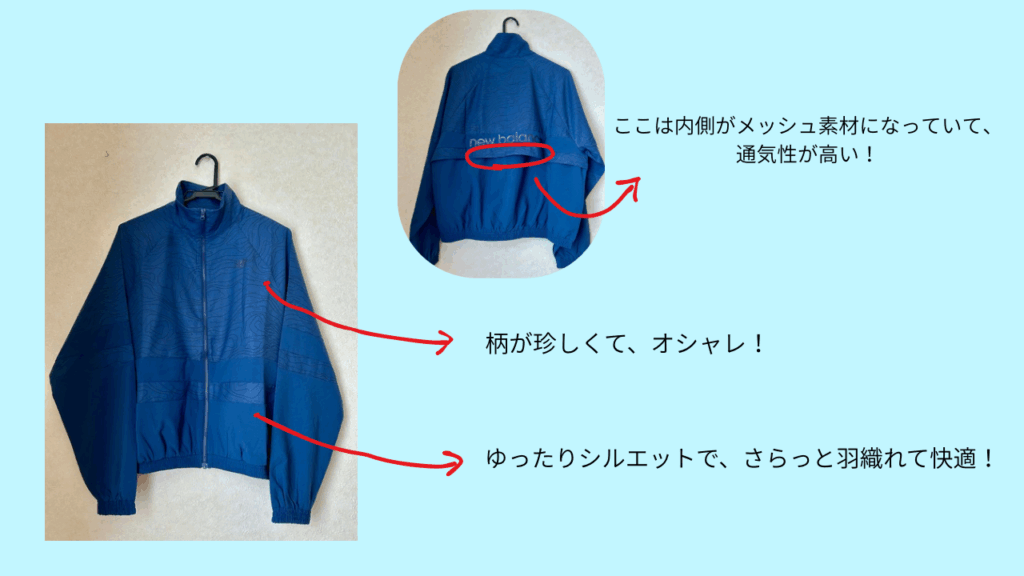 注目アイテム2つ目は、ジャケットです!サラサラした素材で、軽く羽織れるアウターです。 実は、既に同じ形の黒を持っていて、春•秋のランニングの日焼け対策に重宝していました。こちらのアイテムは、オシャレな柄も入っているため、とてかわいいです♡