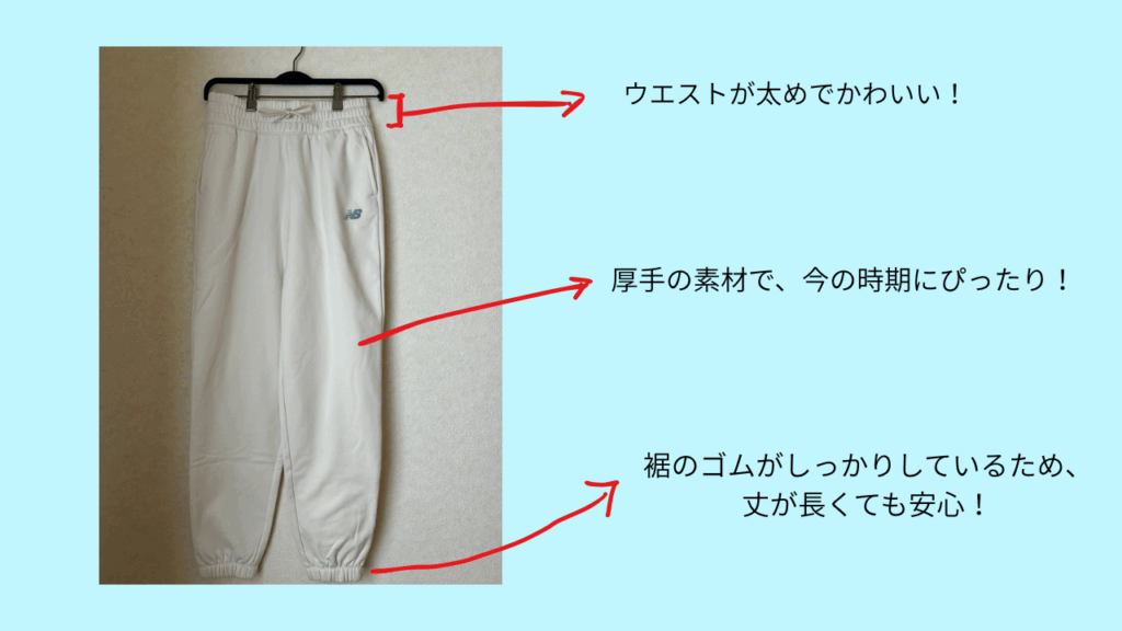 注目のアイテムは、スウェットパンツです!私は、身長が153cmと小さめであるため、なかなか自分に合うスウェットがありませんでした…。しかし、このニューバランスのスウェットは、丈が少し長いですが、綺麗なシルエットで私でも履けました!また、普段だと泥はねや汚れてしまうのが気になって、白はなかなか選びにくいですが、福袋だと新しいカラーにも挑戦できるのでオススメです✨