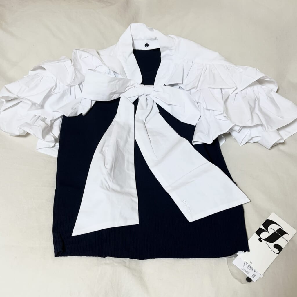 ボリュームたっぷりなリボン付きフリルがとてもキュートなトップス。
