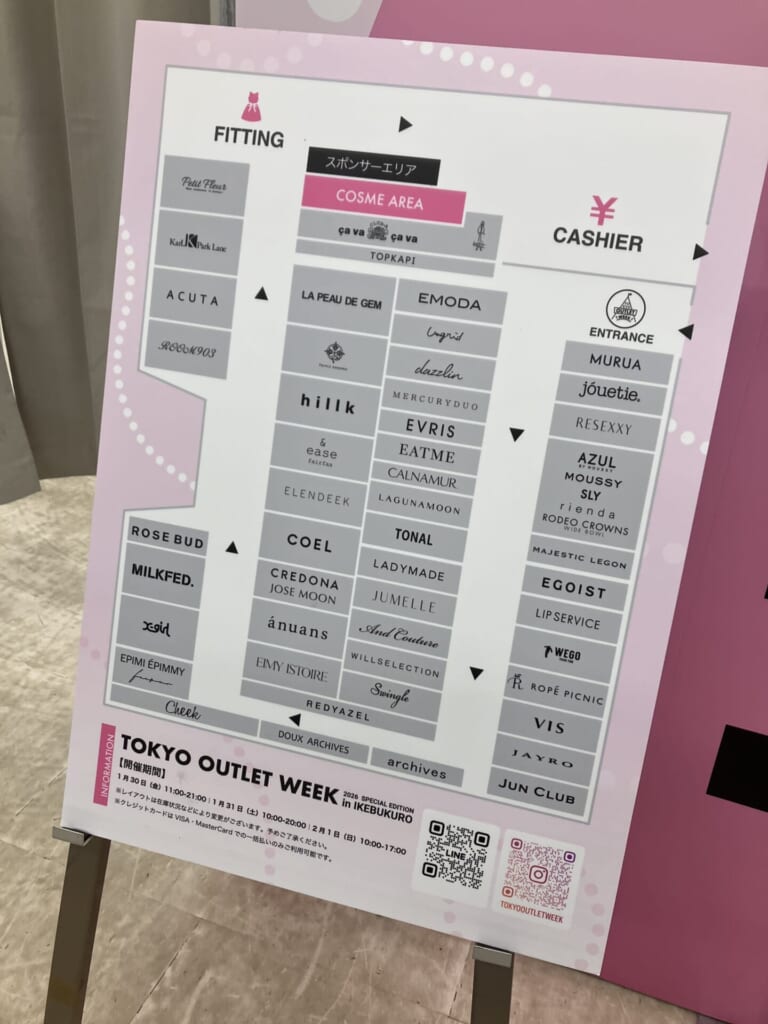 東京アウトレットウィークは国内最大級のファッションアウトレットイベントです。2~3か月に1回の頻度で各地で開かれており、最近は2月に池袋で開催されました!dazzlinやLIP SERVICEなど、一流ブランドの服を50~90%オフで購入することができます✨また、最近はお洋服だけでなくコスメも購入できます。ちなみに今回の池袋に出店されていたブランドは画像の通り👇フェミニン系やモード系まで、多種多様なブランドさんが来ていたので、どんな方も楽しめると思います!