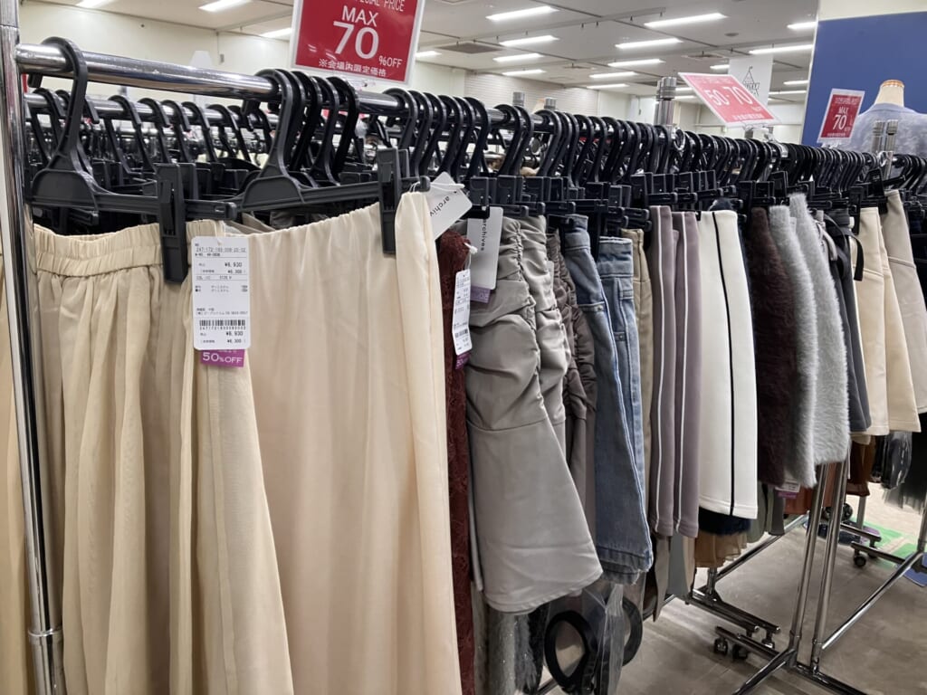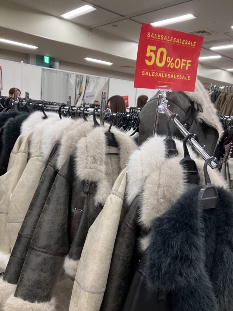 毎回、そのシーズン前後の服が中心となっており、今回は冬~春先の服が中心になっていました。そして、どれも50%や70%などおトクすぎる!!オンラインや店舗でもセールになっていた服もありますが、他では見つからないセール服もあります。鏡が置いてあるためすぐに合わせますし、並んだら試着することもできるため、じっくり悩んで選ぶことができます。