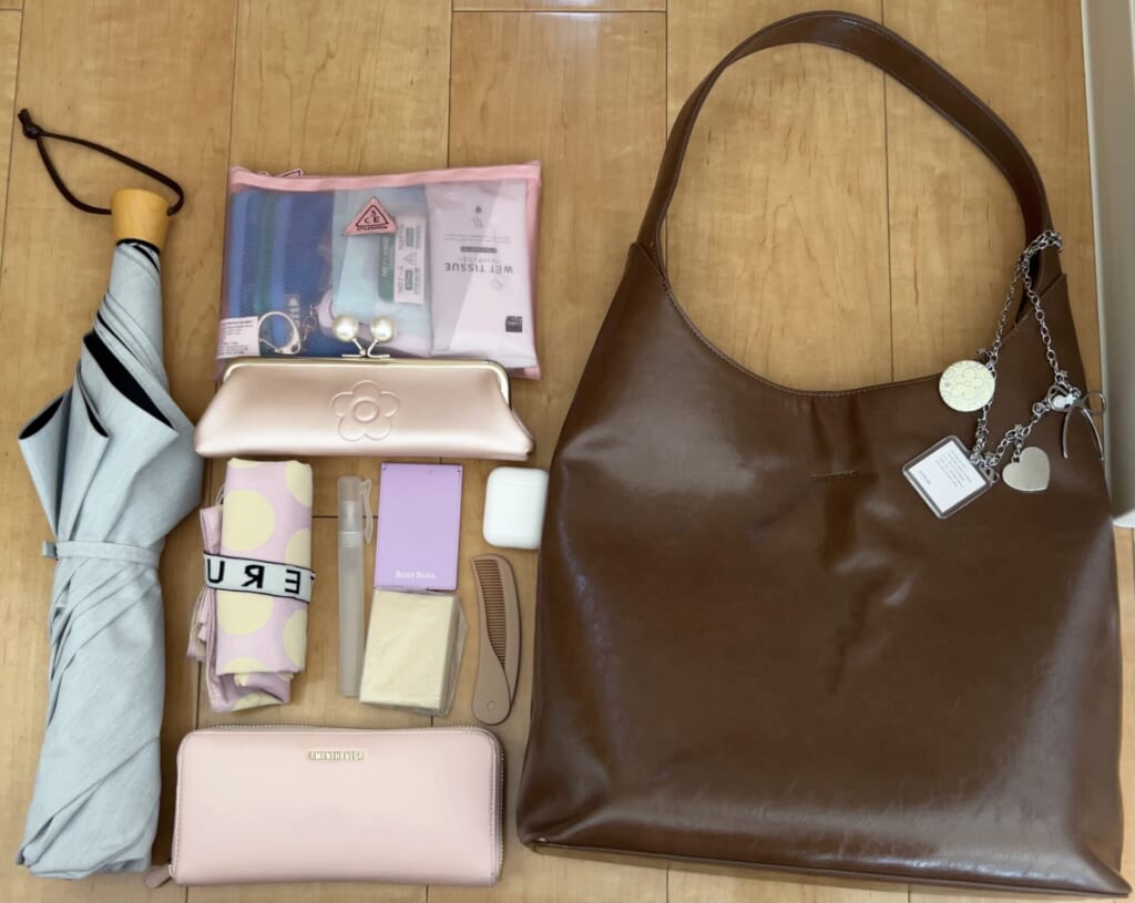 サンバリアの日傘、小物が入ったポーチ、筆箱、エコバッグ、アルコール消毒液、鏡、使い捨てハンカチ、AirPods、コーム、お財布です!