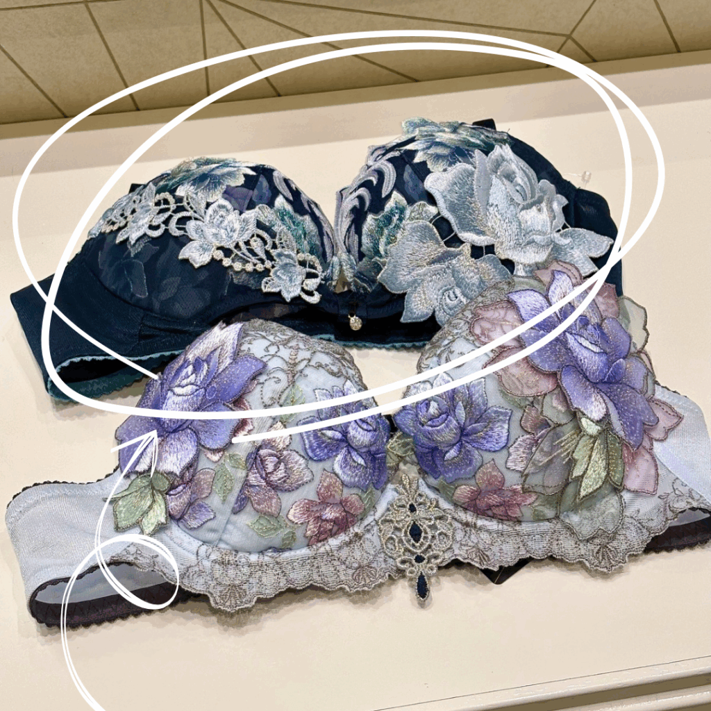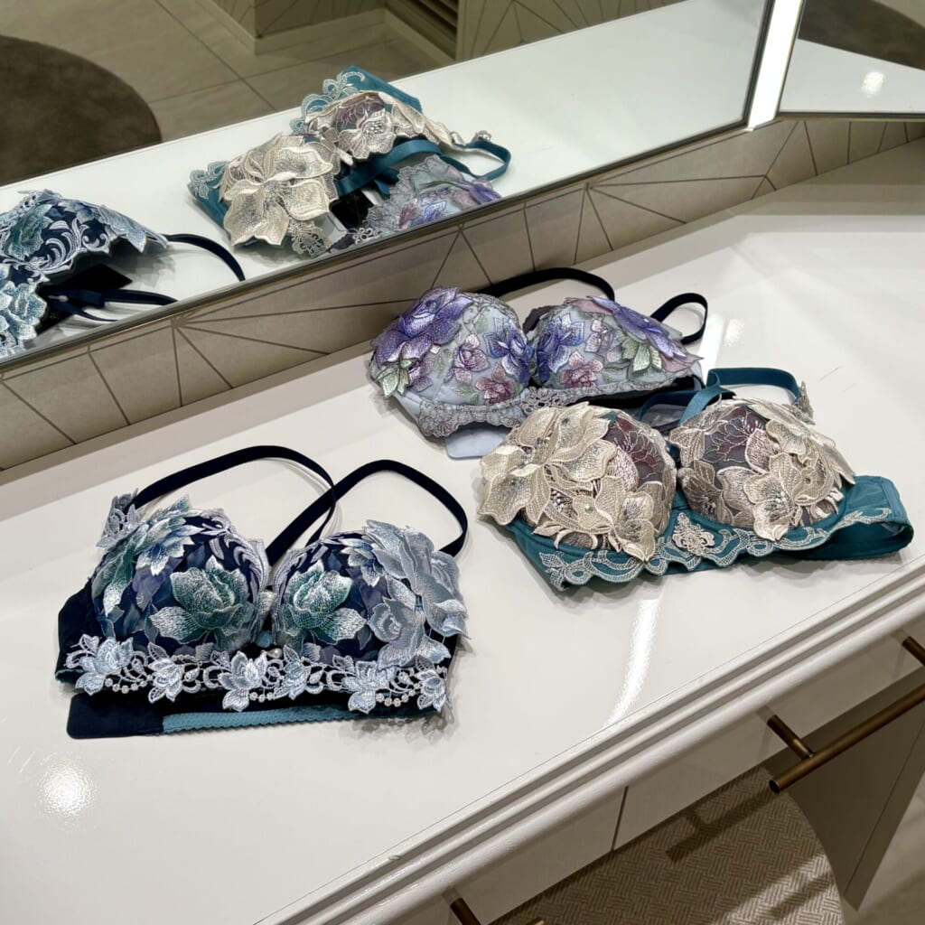 いくつか試着してみて、サルートというブランドのリボンブラが私の体型に一番フィットしました!(写真上のダークネイビーのブラジャー)リボンブラはキープリボン構造で、きれいな谷間を作ってバストメイクしてくれるブラジャー。 店舗には他にも、ピンクやベージュ系などさまざまなカラーのリボンブラがあり、それぞれ異なる魅力があって可愛かったです!