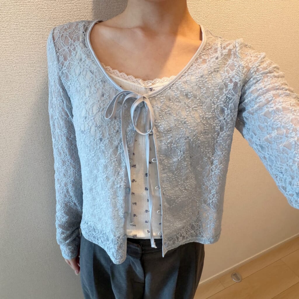 レースカーディガンがクロップド丈なので、インナーのフリルがいい感じに見えて可愛いです♡
