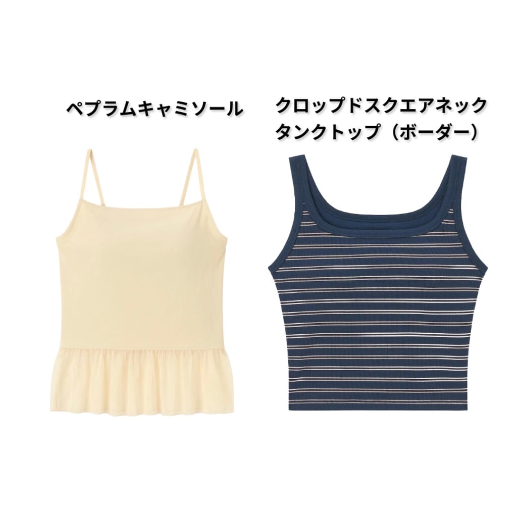 2つ目は、『ブラフィールクロップドスクエアネックタンクトップ(ボーダー)』(¥1,490)。デコルテをきれいに見せてくれるスクエアネックがポイントです!また、水玉の次に流行りつつあるボーダー柄!インナーコーデに取り入れるだけで、簡単におしゃれコーデが完成します。また、暑くなってきたら、これ一枚でも◎