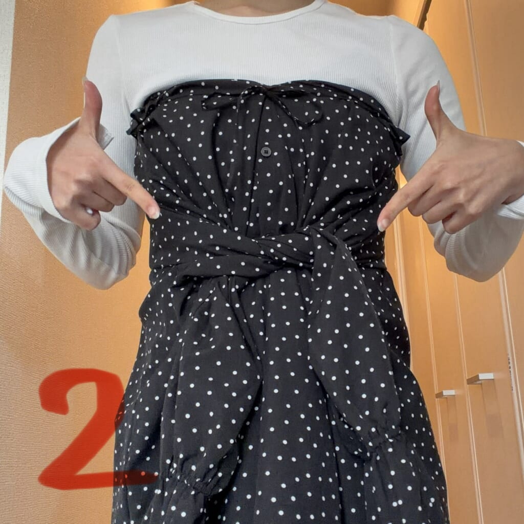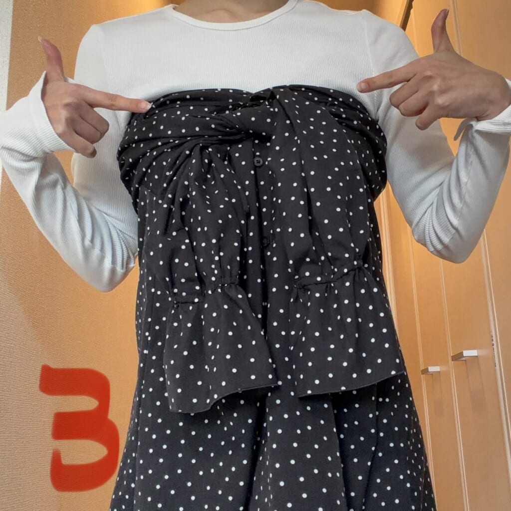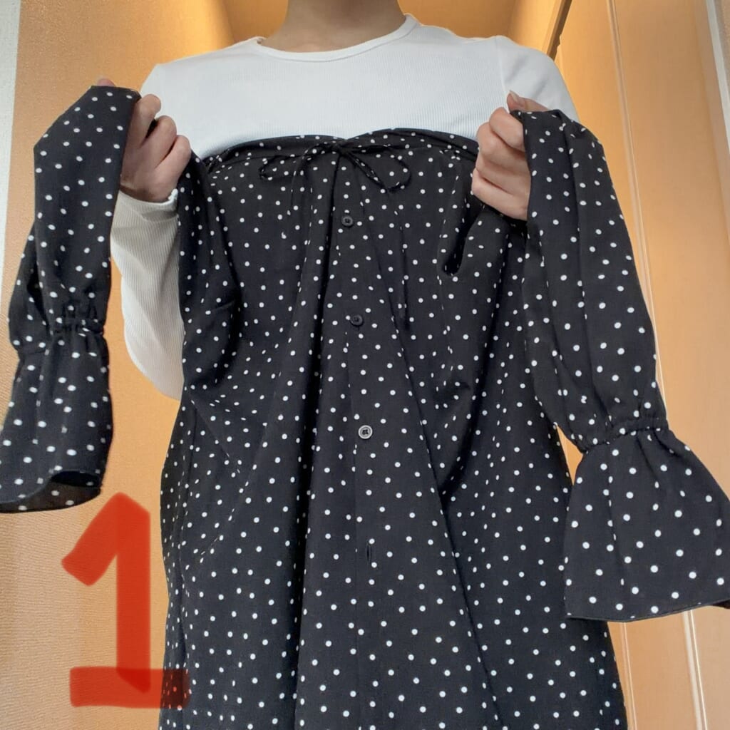 流行りの水玉がとっても可愛い♡首の部分と、袖部分がフリルになっているので、重ね着をしてチラ見せするのがおすすめです!
