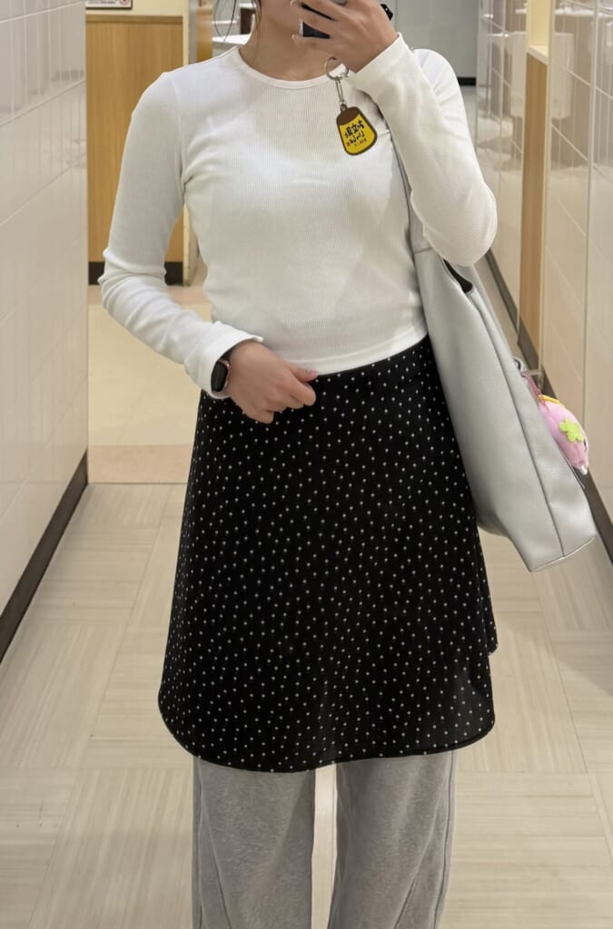こちらは、ドットブラウスを腰に巻いて巻きスカート風にアレンジしています。