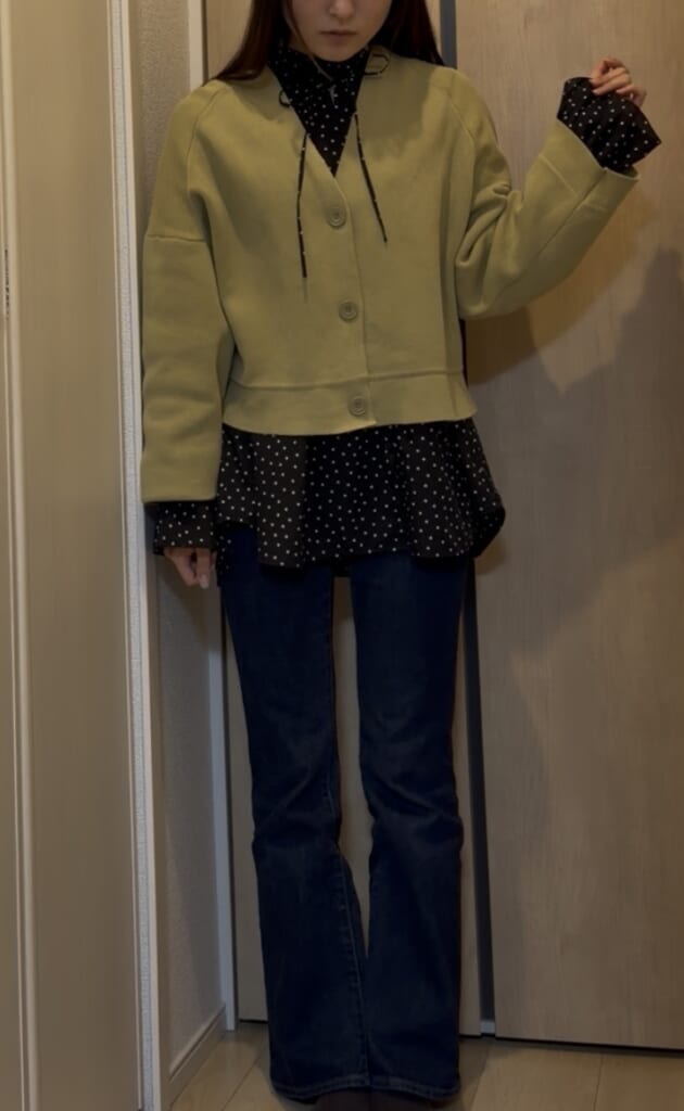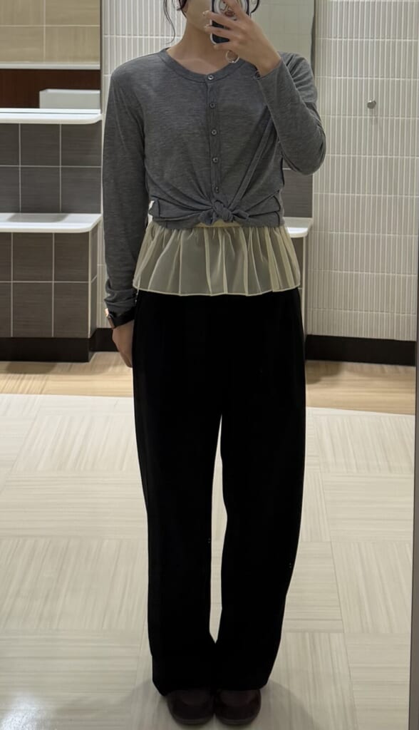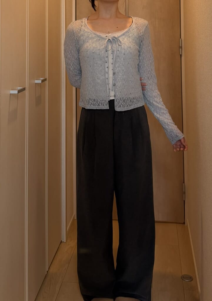最後は、ブラウスの上にカーディガンをレイヤードしたガーリーコーデ。