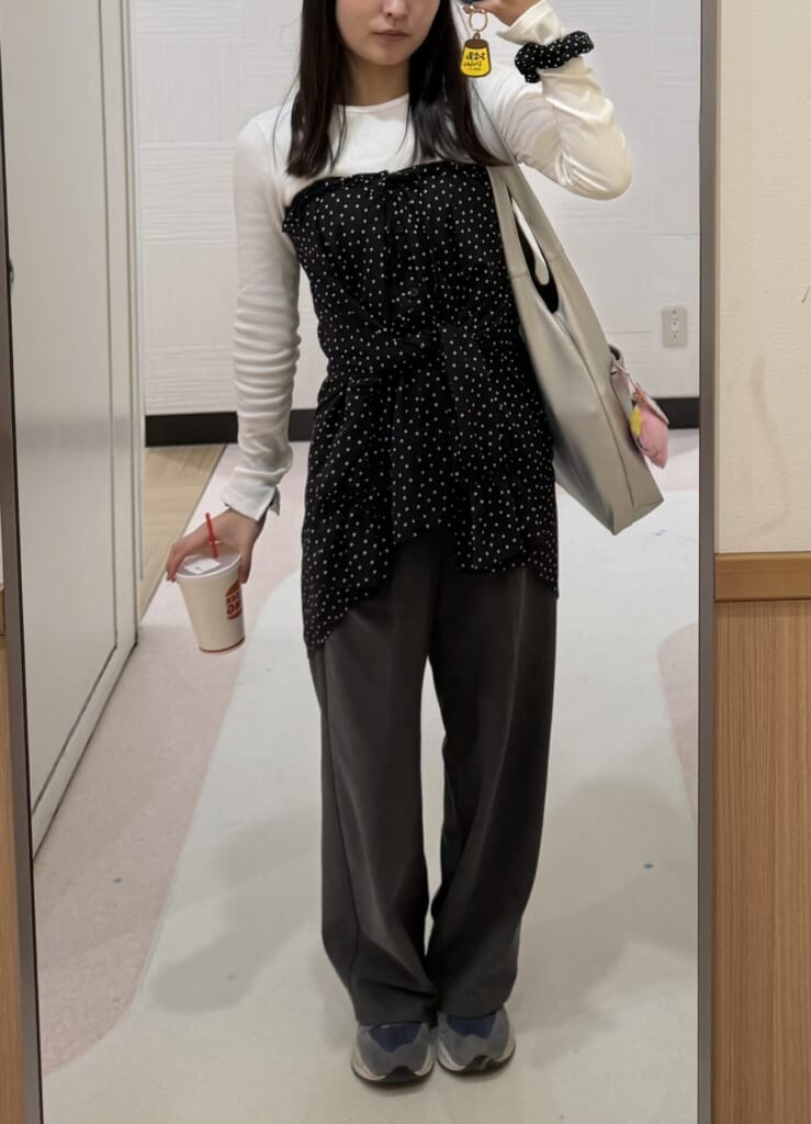 トレンドのドットブラウスをビスチェ風にアレンジしたカジュアルガーリーコーデ。ドットのブラウス単体では、ガーリーな印象が強いですが、グレーのスラックスと合わせることで、甘さを抑え、大人っぽくまとめました♪