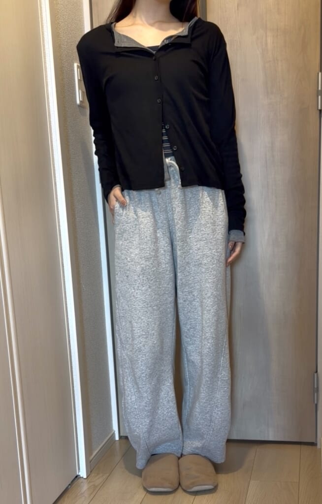 グレーのスウェットパンツにシアーカーディガンを2枚レイヤードした大人カジュアルコーデ。