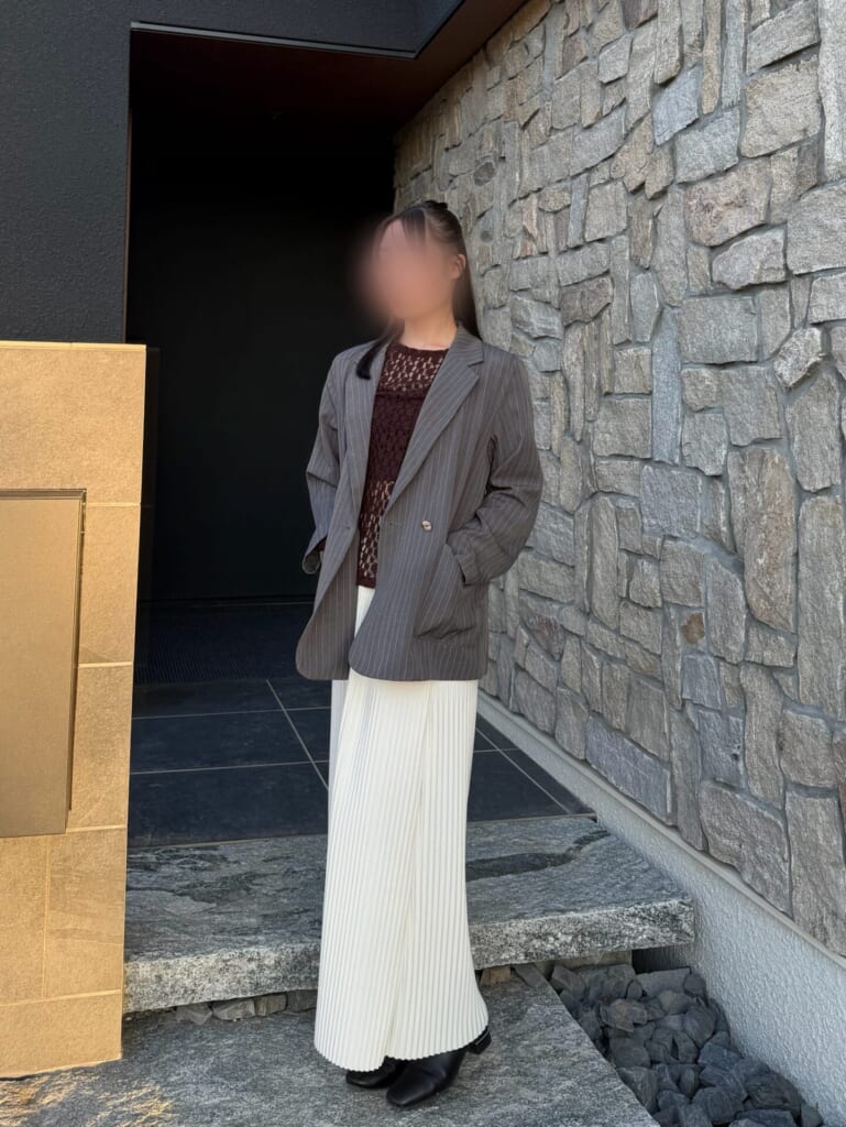 また、全体的に暗めですが、透かし編みトップスと白いスカートで春らしさもしっかり取り入れてます♪