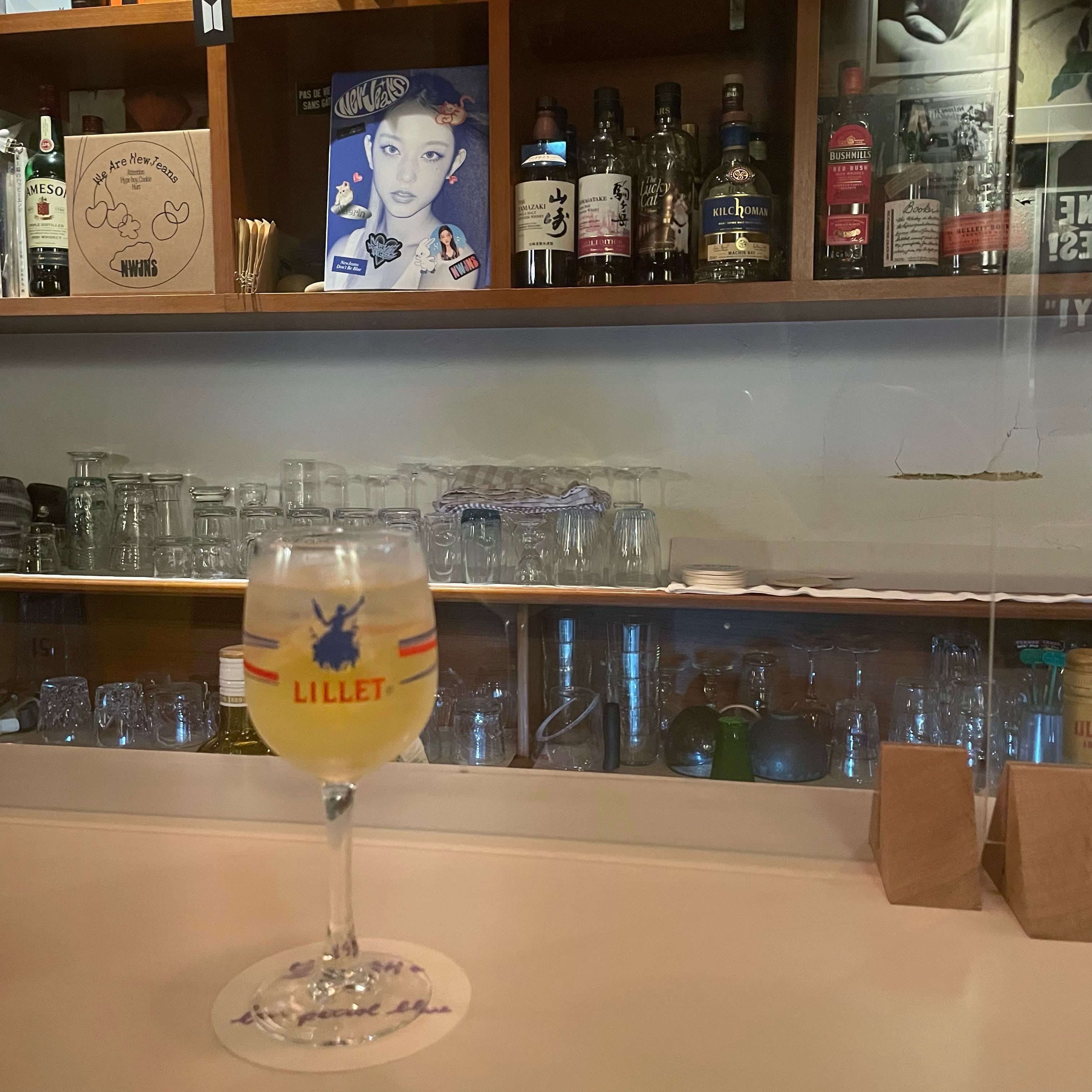 店主が音楽好きな方なのですがK-POPも好きなようで、私がお店に行ったときはヘリンちゃんver.のNewJeansのアルバムがカウンター席の目の前に飾られていました♡実はこのグラスの下にあるコースターにもハングルで文字が書かれています笑笑