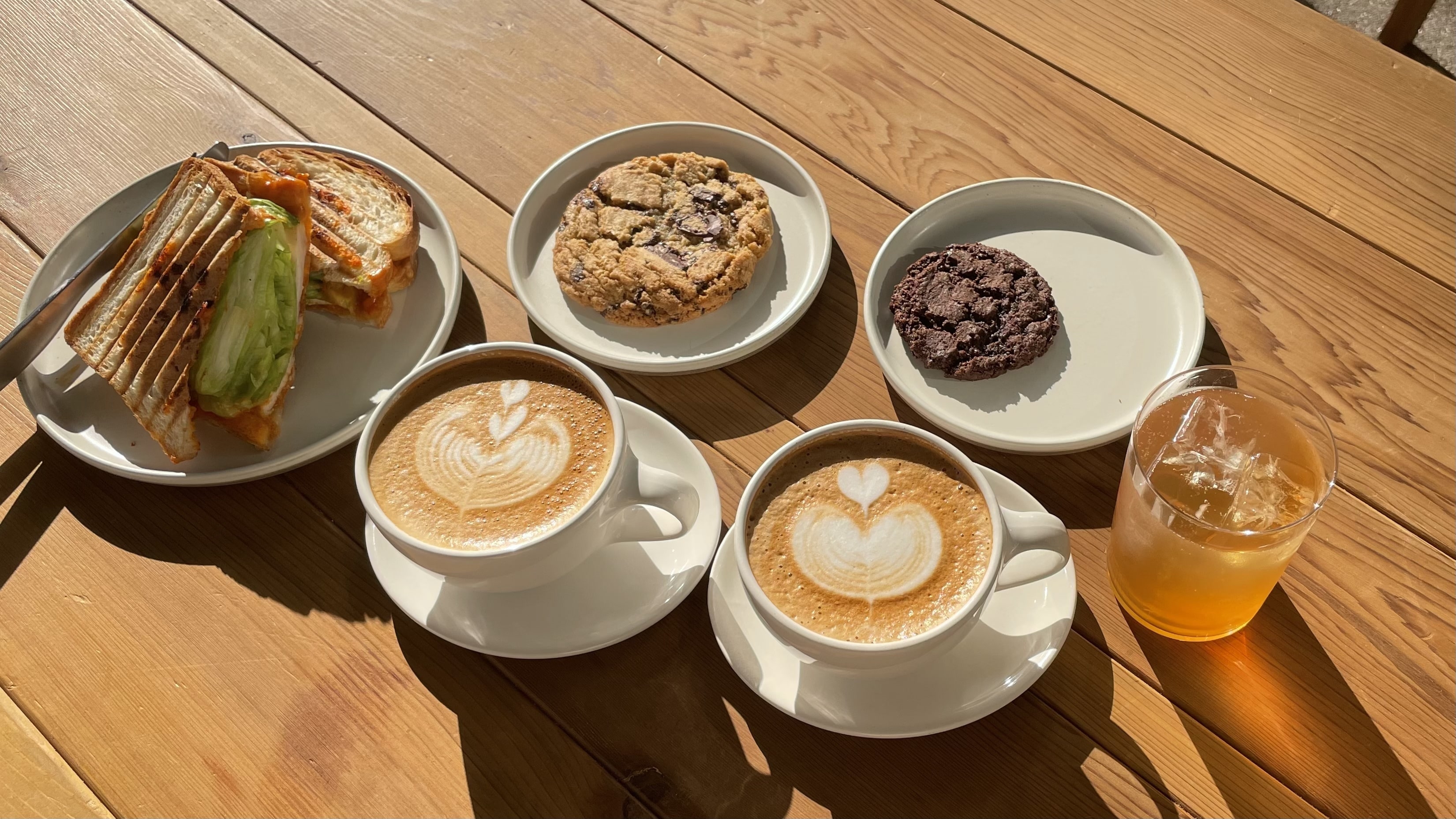コーヒーチェリーフィズ、カフェラテ、ダブルチョコレートチップクッキー、チョコレートチップクッキー、グリルドサンドイッチ レタス&チキン です!
