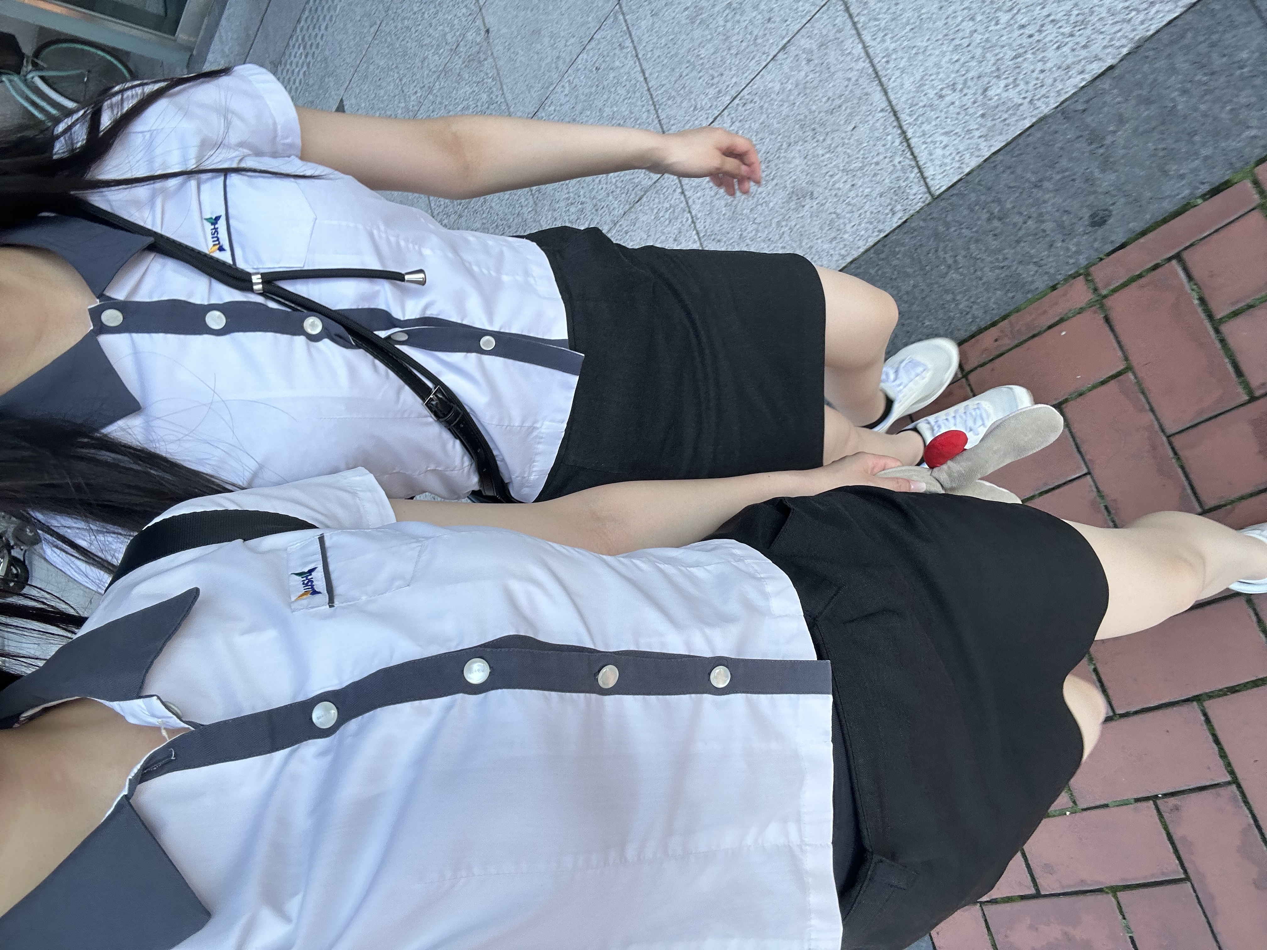 私たちはグレーの衿と線が入ったトップスとタイトな黒のスカートをレンタルしました!