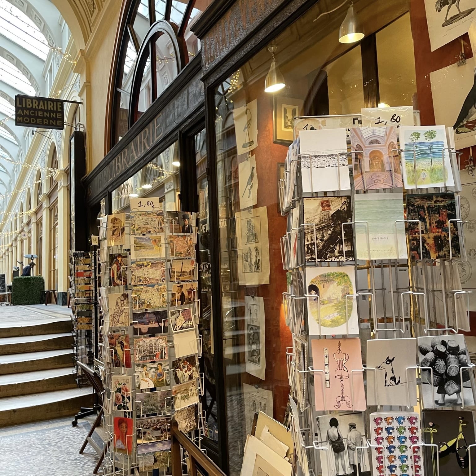 パッサージュの奥にある古書店は、タイムスリップできそうなミステリアスで暖かい雰囲気。クリスマス前だったこともあり、たくさんのクリスマスカードが?