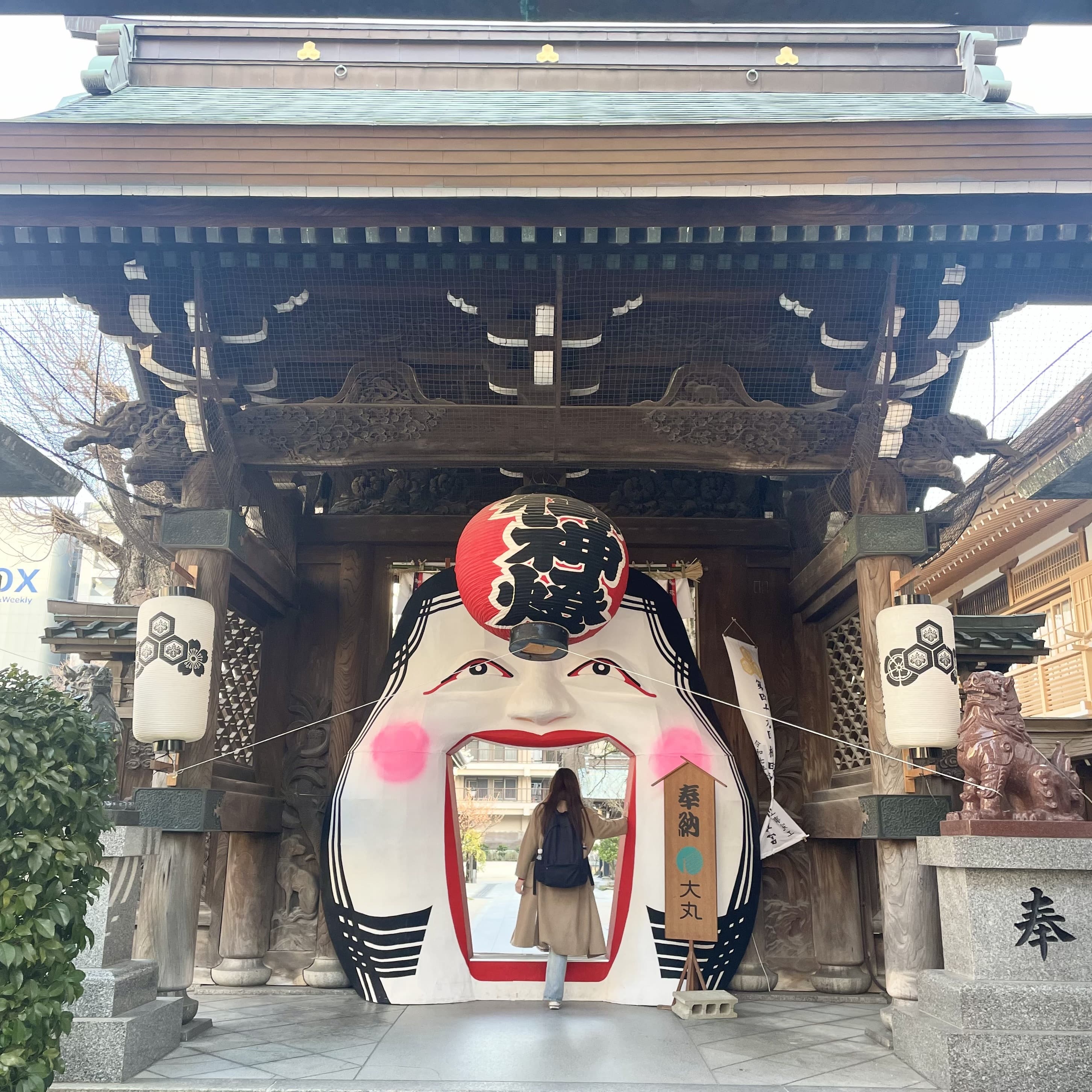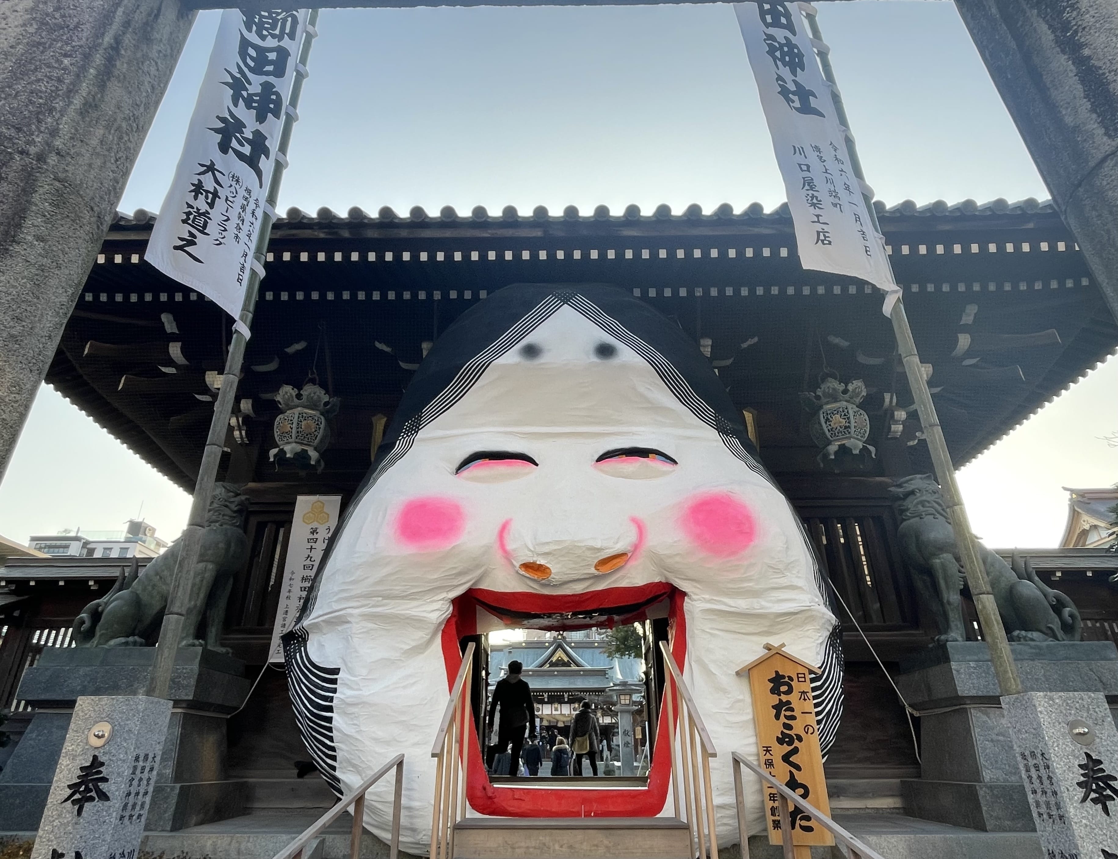 私が訪れた際は節分の時期ということもあって、入口各所に「大お多福面」が飾られていました。