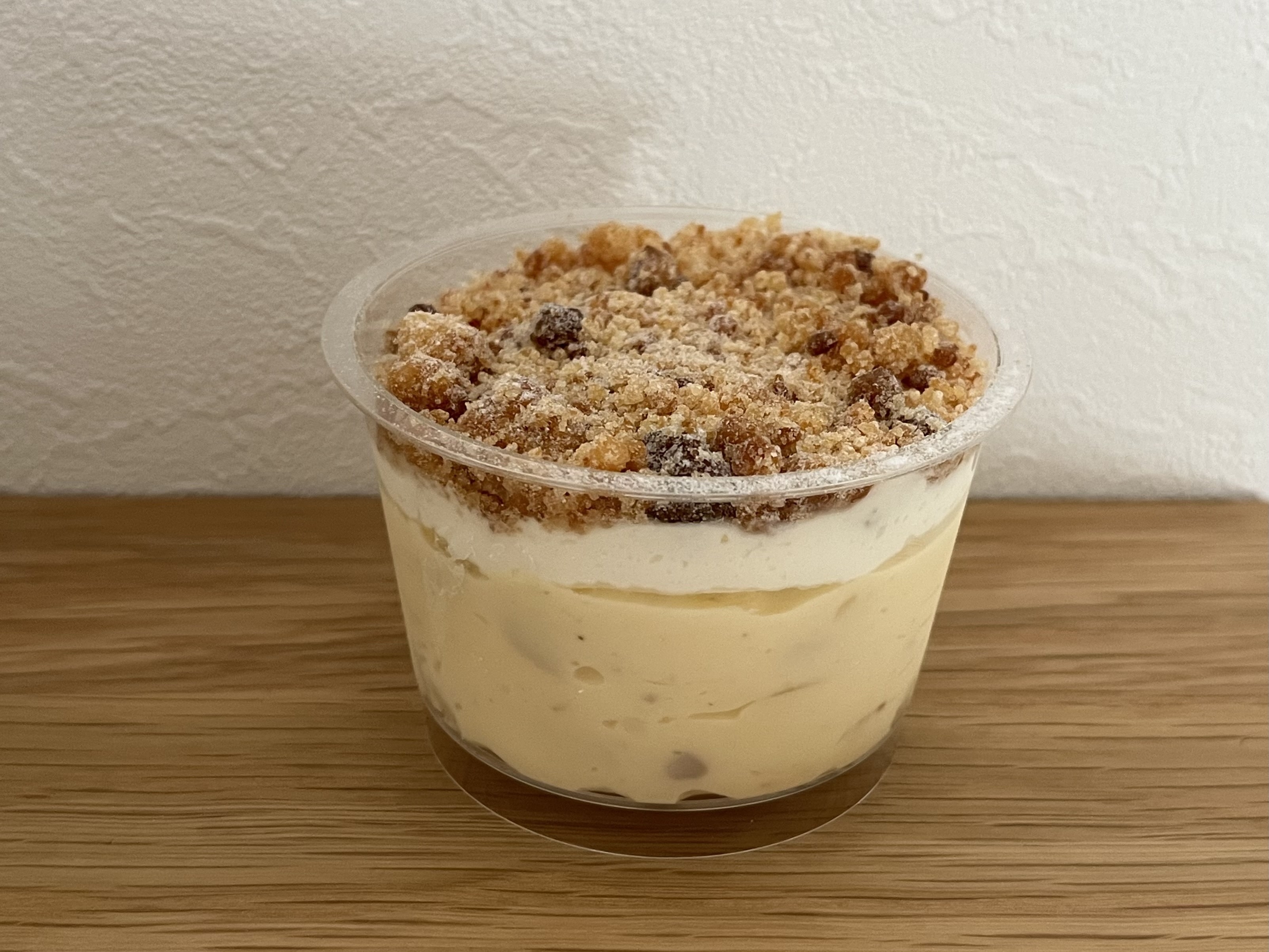 シュトロイゼル、生クリーム、カスタードクリーム、レーズンとアーモンドスライスが入ったチーズクリームがカップにたっぷりと詰まっています。“生”チーズケーキとだけあって、とろっとしたレアチーズケーキのような食感です♡よくあるカップスイーツの1.5倍くらいの大きさだから何人かでシェアするのもアリ?