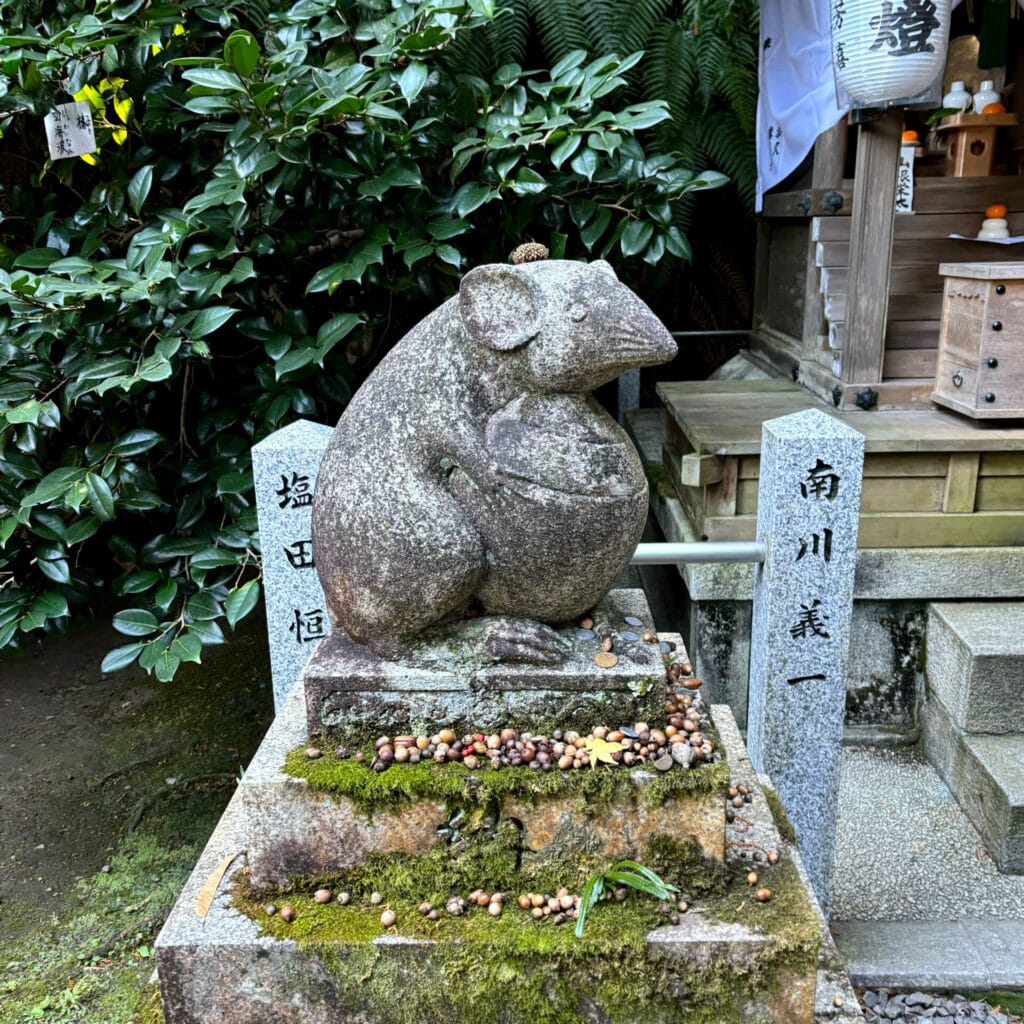 大豊神社は、本殿だけでなく末社という小さい神社がいくつもあり、中でも大国社の狛ねずみが有名。境内には狛ねずみが建てられていて、「ねずみの社」とも言われているとか。