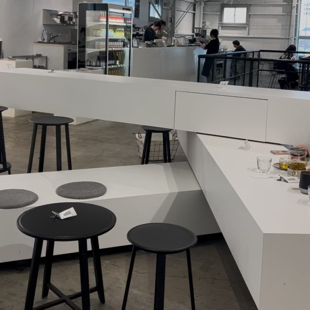 木材倉庫をリノベーションしたカフェで、白い壁に、黒い椅子や手すりのコントラストがおしゃれ✨