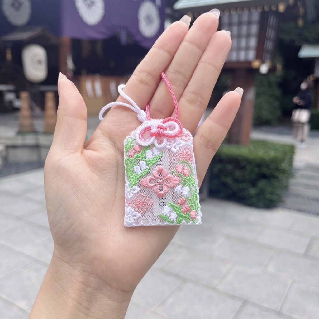 このお守りには「幸福が訪れる」という花言葉が込められていて、糸と糸が編み込まれたデザインが、縁や絆の強さを象徴しているそうです。