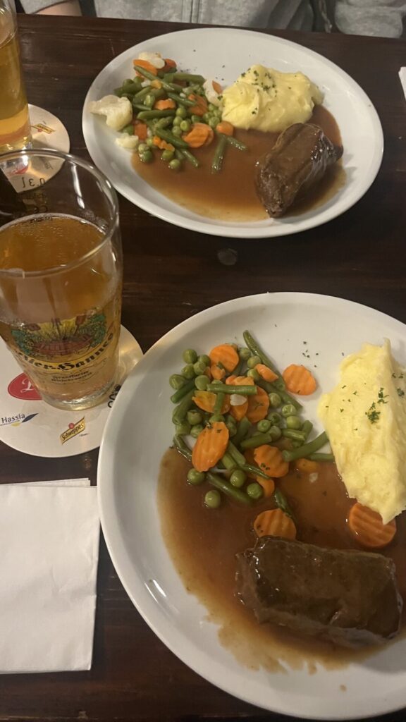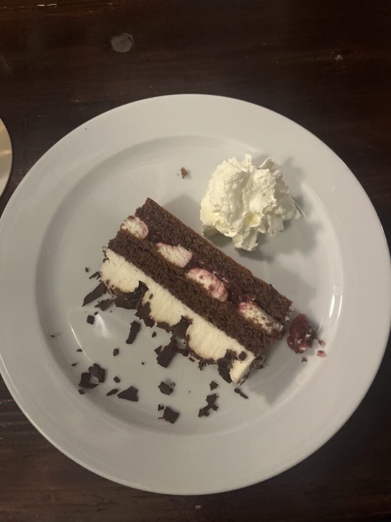 近くのレストランにてお店のお姉さんおすすめのビールとお料理をいただきました!🍻🍖デザートのケーキが中でも格別でした🤤スイーツは別腹!笑