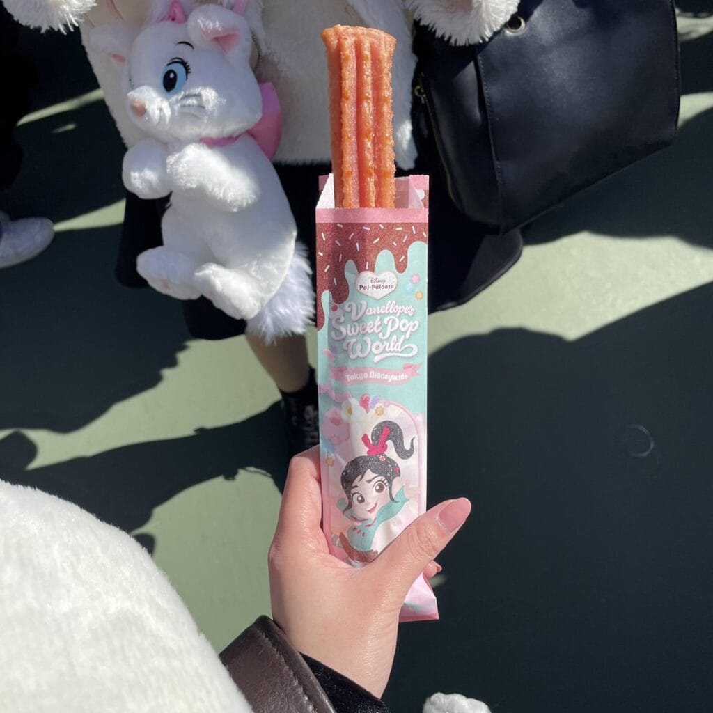 カリブの海賊近くのパークサイドワゴンで、パルパル―ザ限定メニューのチュロスを購入♡パッケージがヴァネロペで可愛い🍓