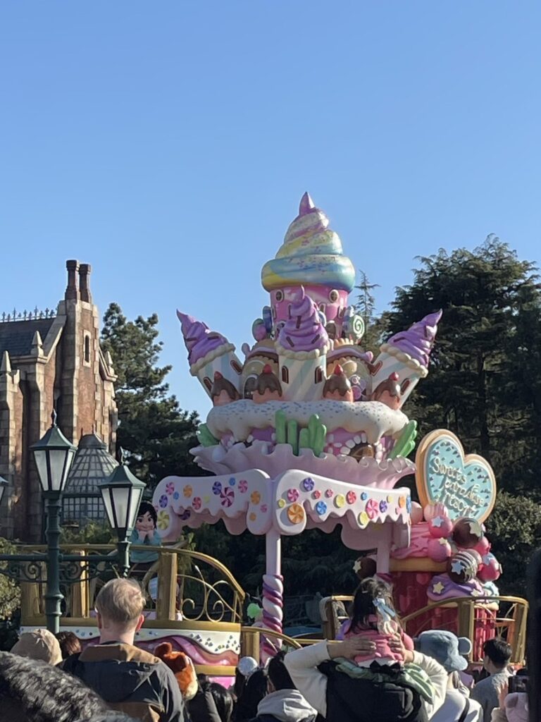 ピーターパンに並んでいた時間が、ちょうど「イッツ・ア・スウィーツフルタイム!」のパレードの時間で、並びながらパレードをみることが出来ました!