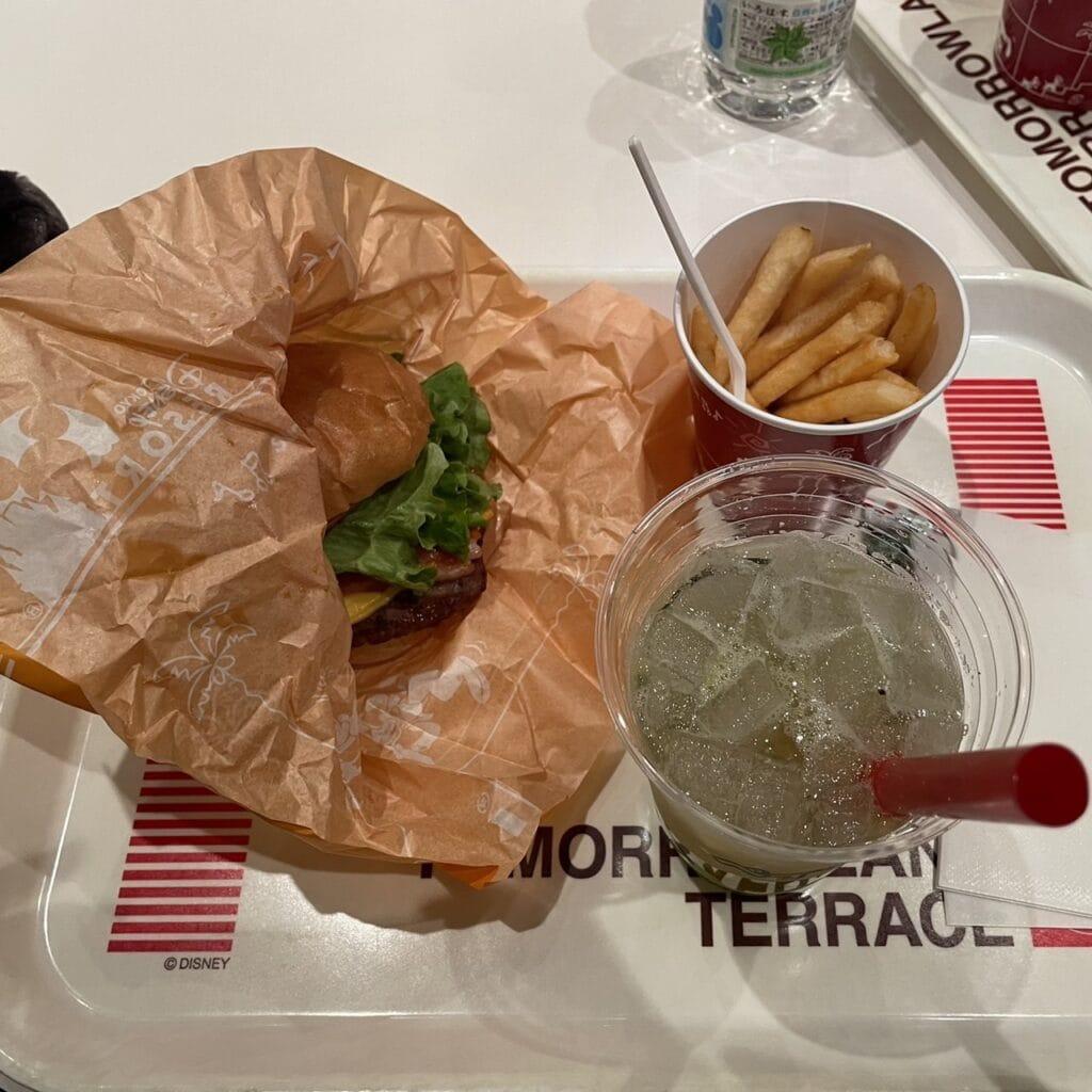 夜ご飯はバーガーをめがけて、「トゥモローランドテラス」へ。トゥモローランドテラスは座席数が多いし、エレクトリカルパレード後にかなり空く傾向にあるので、この時間にごはんを食べるのがおすすめ◎