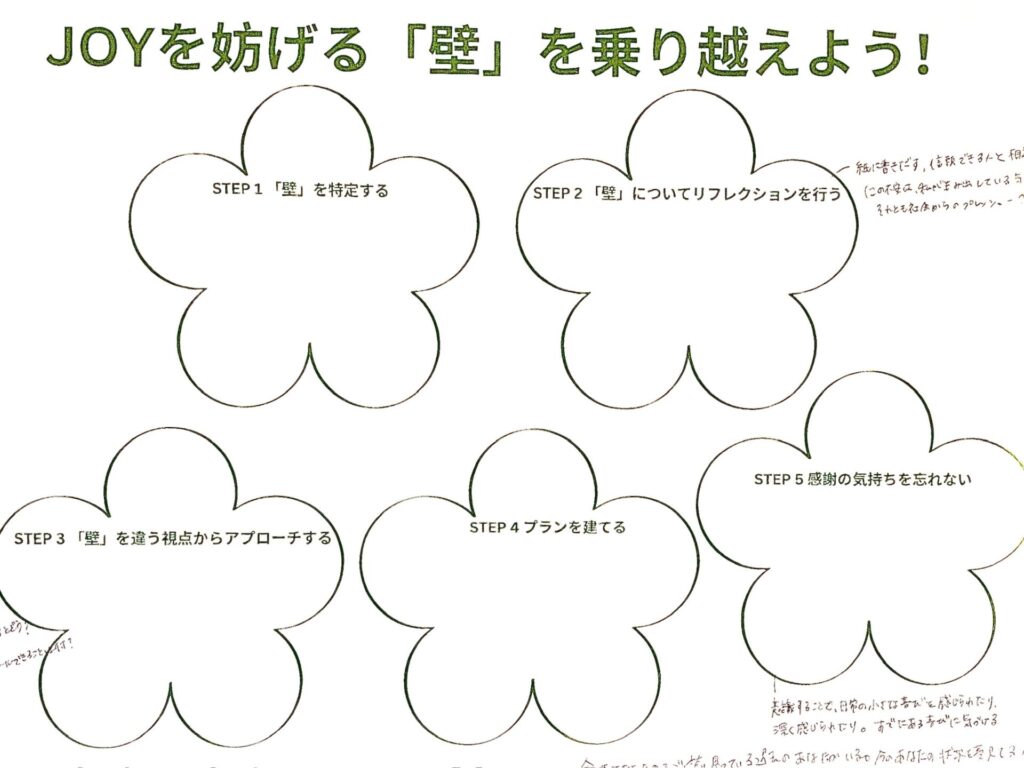JOYを感じる方法はわかりましたが、私たちはいつでもJOYを感じられているわけではありません . . . 。では、その妨げとなっている「壁」とは何なのか。ワークシートを使いながら、思考を整理して考えてみます!