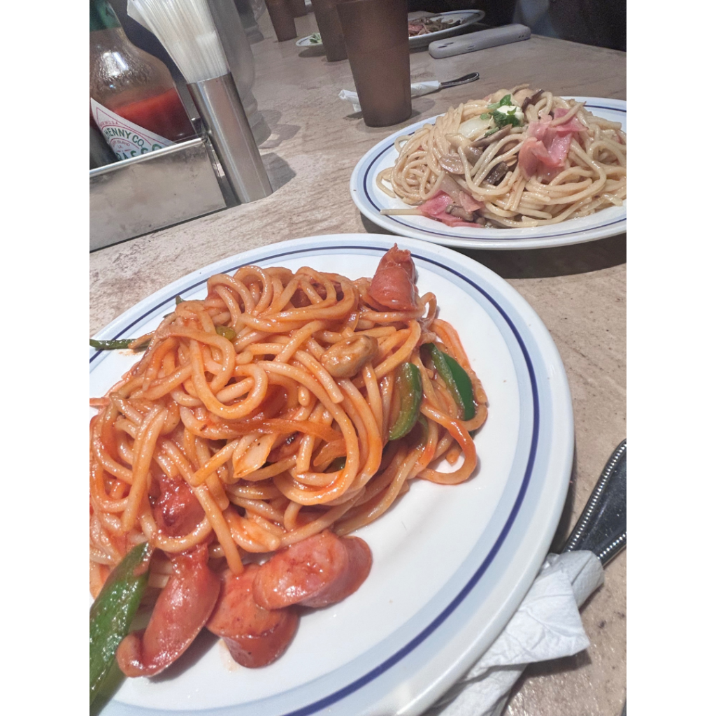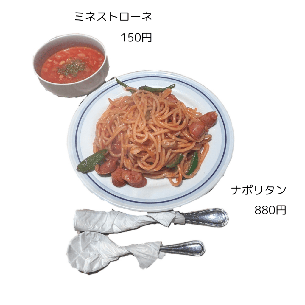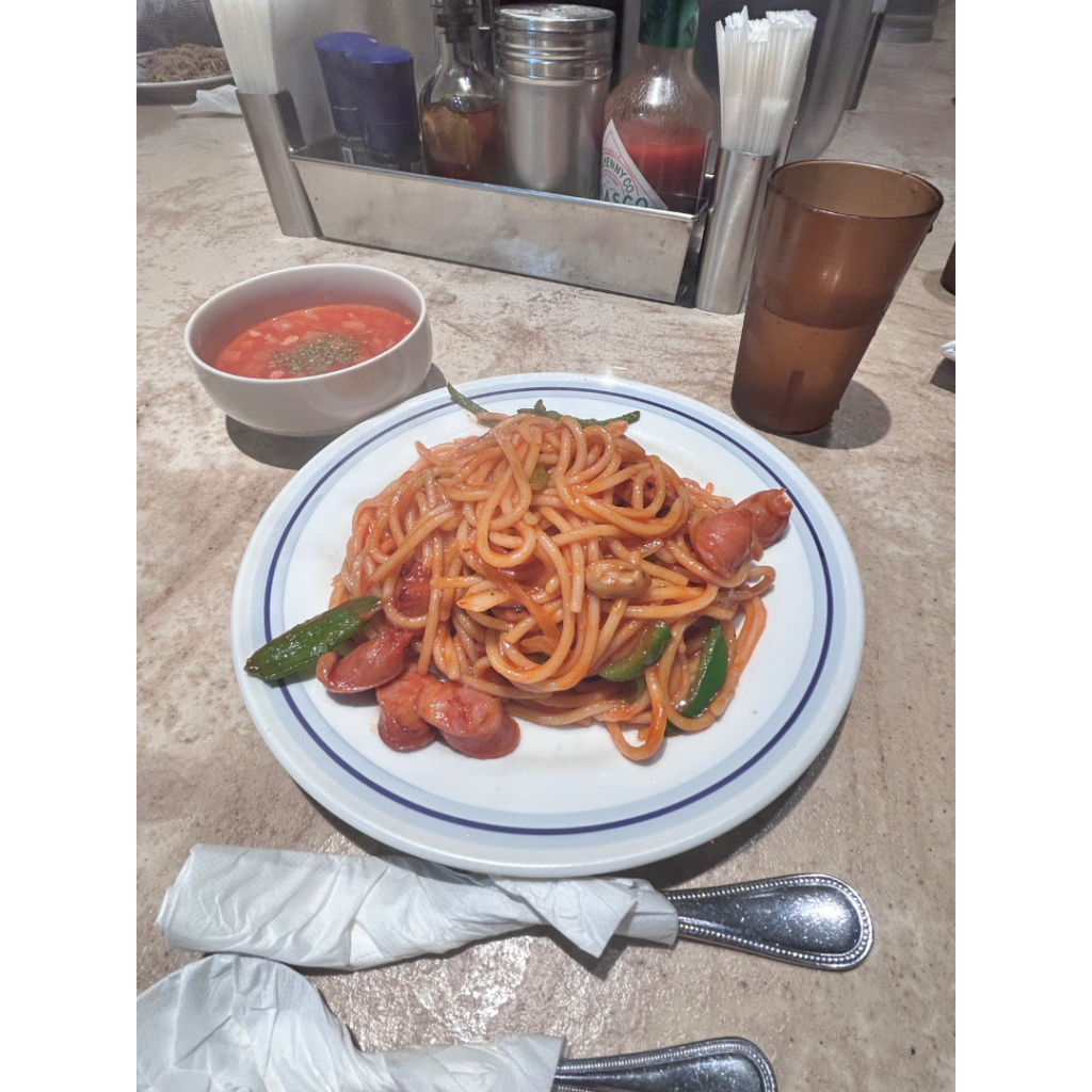 私は、ナポリタンスパゲティにミネストローネのスープをつけました。できたてで席に運んでもらえたので、とても美味しかったです。スパゲティの麺がもちもちしていて良かったです。