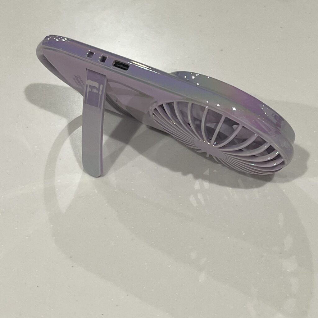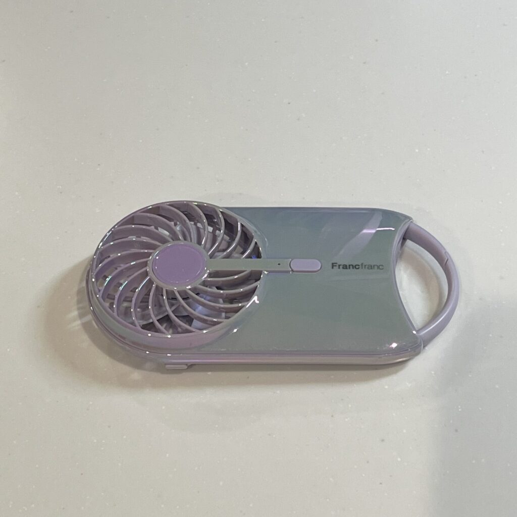 そして2024年、コンパクト型で持ち歩きに最適な「フレ キャリーファン」オーロラパープルを購入しました。(2980円)